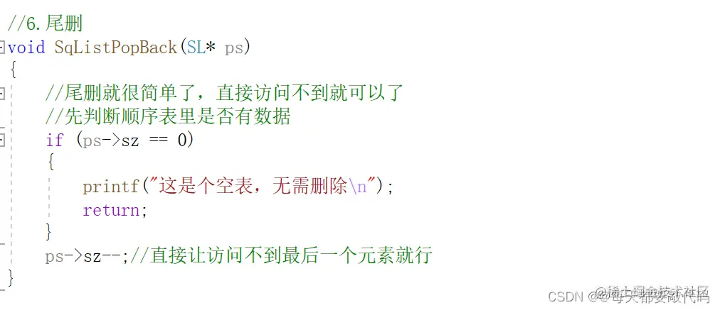 对于尾删也很简单,直接让ps->sz--访问不到最后一个元素就可以了: