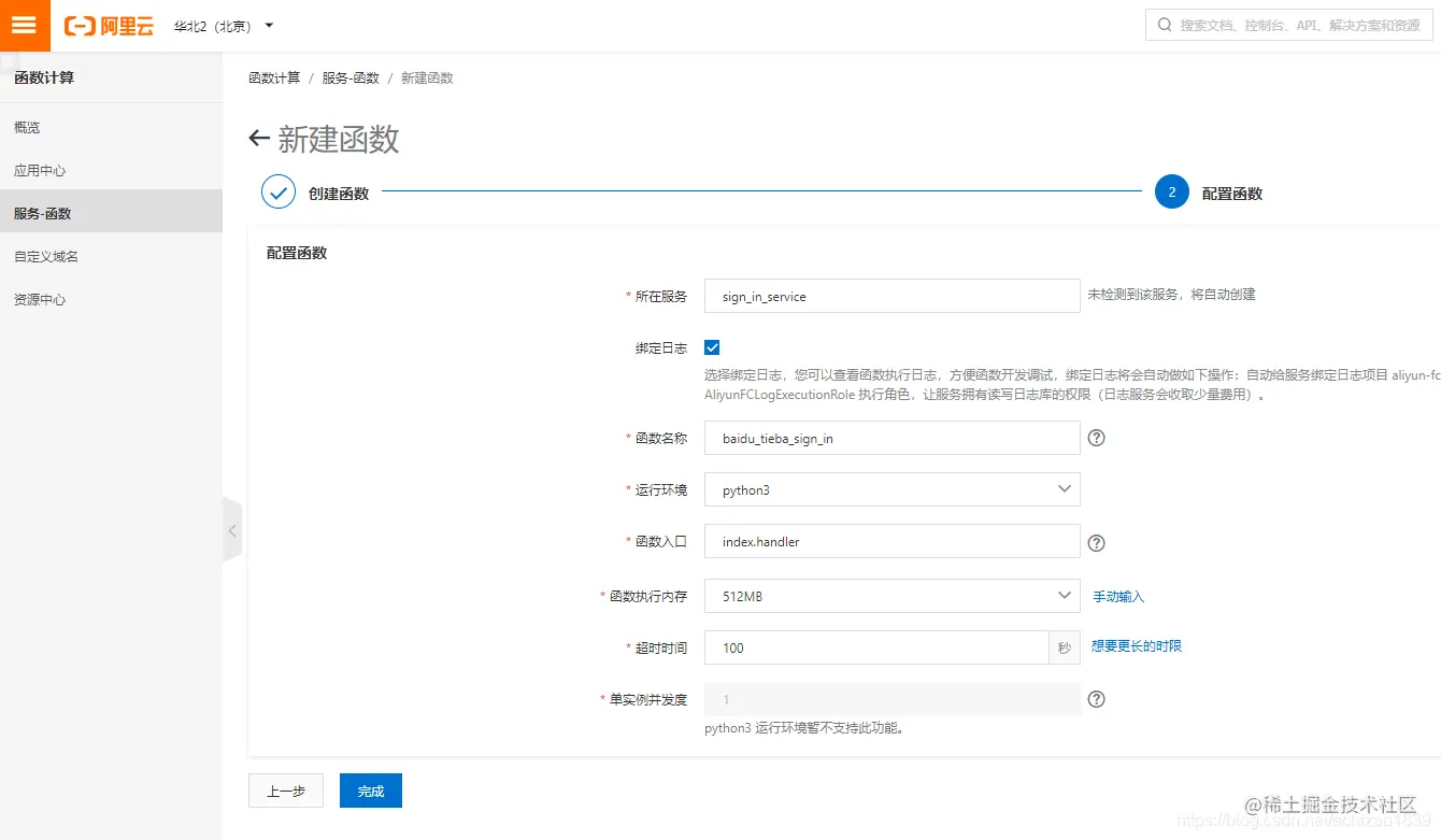 填写函数运行环境(服务名字唯一,提示已经存在请改名)