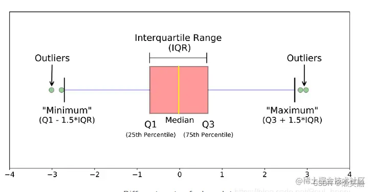 四分位间距 (interquartile range, IQR), 表示下四分位数Q1和上四分位数Q3的间距;