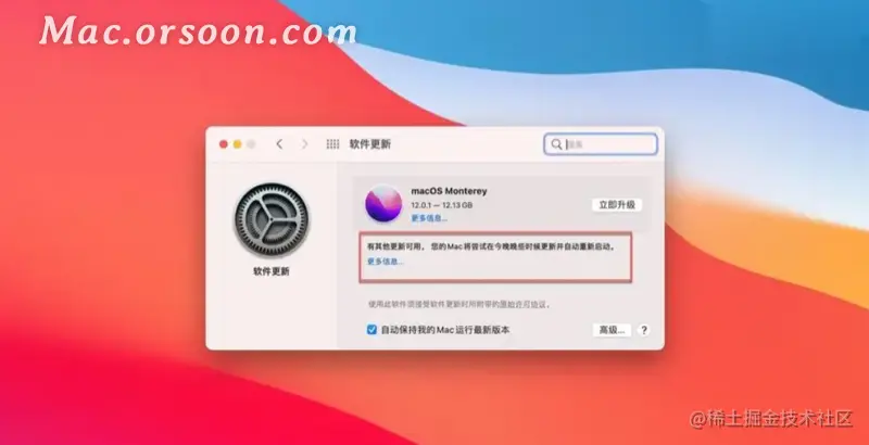 选择系统偏好设置 > 软件更新。您应该会看到最新版本的 macOS 更新可用。单击立即升级以下载并安装它。