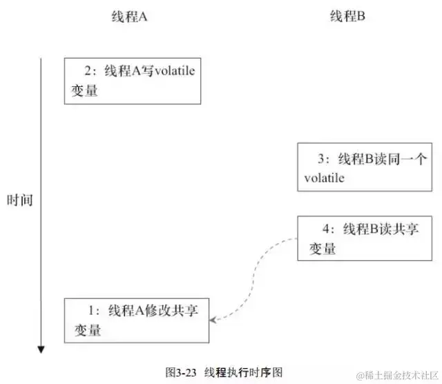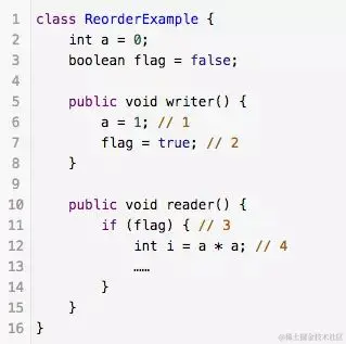 当1和2之间没有数据依赖关系时,1和2之间就可能被重排序(3和4类似)。这样的结果就是:读线程B执行4时,不一定能看到写线程A在执行1时对共享变量的修改。