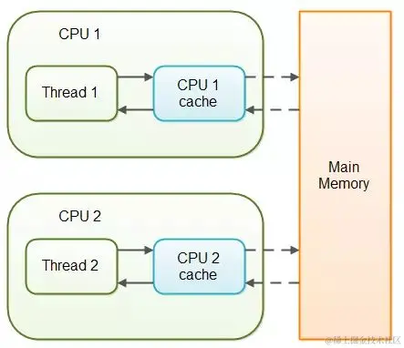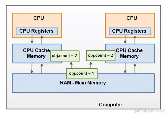如果两个或者更多的线程在没有正确的使用volatile声明或者同步的情况下共享一个对象,一个线程更新这个共享对象可能对其它线程来说是不可见的:共享对象被初始化在主存中。跑在CPU上的一个线程将这个共享对象读到CPU缓存中,然后修改了这个对象。只要CPU缓存没有被刷新会主存,对象修改后的版本对跑在其它CPU上的线程都是不可见的。这种方式可能导致每个线程拥有这个共享对象的私有拷贝,每个拷贝停留在不同的CPU缓存中。