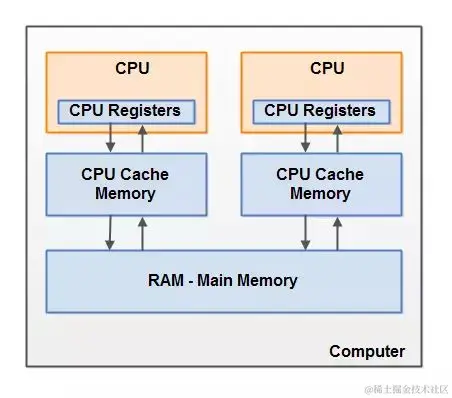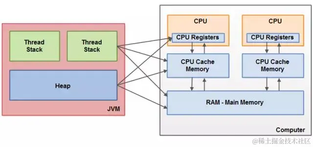 Java内存模型与硬件内存架构之间存在差异。硬件内存架构没有区分线程栈和堆。对于硬件,所有的线程栈和堆都分布在主内存中。部分线程栈和堆可能有时候会出现在CPU缓存中和CPU内部的寄存器中。如下图所示: