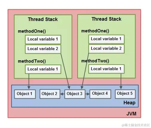 - 存放在堆上的对象可以被所有持有对这个对象引用的线程访问。当一个线程可以访问一个对象时,它也可以访问这个对象的成员变量。如果两个线程同时调用同一个对象上的同一个方法,它们将会都访问这个对象的成员变量,但是每一个线程都拥有这个成员变量的私有拷贝。