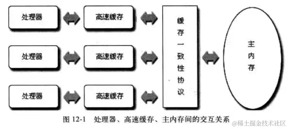 - 缓存一致性问题:在多处理器系统中,每个处理器都有自己的高速缓存,而它们又共享同一主内存(MainMemory)。基于高速缓存的存储交互很好地解决了处理器与内存的速度矛盾,但是也引入了新的问题:缓存一致性(CacheCoherence)。当多个处理器的运算任务都涉及同一块主内存区域时,将可能导致各自的缓存数据不一致的情况,如果真的发生这种情况,那同步回到主内存时以谁的缓存数据为准呢?为了解决一致性的问题,需要各个处理器访问缓存时都遵循一些协议,在读写时要根据协议来进行操作,这类协议有MSI、MESI(IllinoisProtocol)、MOSI、Synapse、Firefly及DragonProtocol,等等: