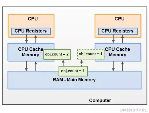 下图示意了这种情形。跑在左边CPU的线程拷贝这个共享对象到它的CPU缓存中,然后将count变量的值修改为2。这个修改对跑在右边CPU上的其它线程是不可见的,因为修改后的count的值还没有被刷新回主存中去。