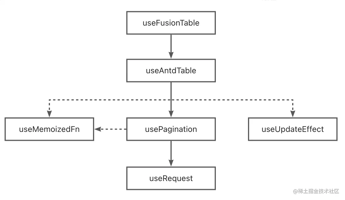 如上图所示,描述了useFusionTable、useAntdTable、usePagination、useRequest四个hook的调用依赖关系。