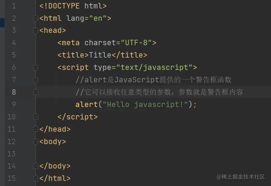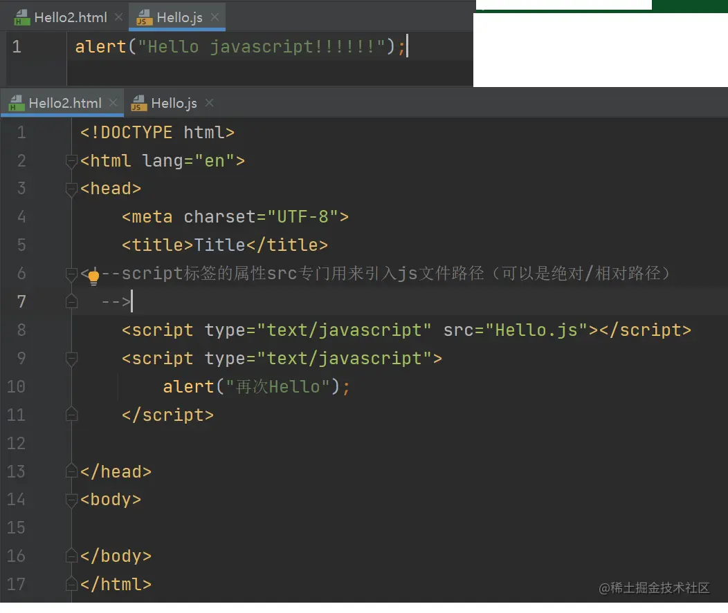 script标签可以用来书写JavaScript代码,也可以用来引入JavaScript文件,但是注意这二者只能二选一,不能同时使用两个功能