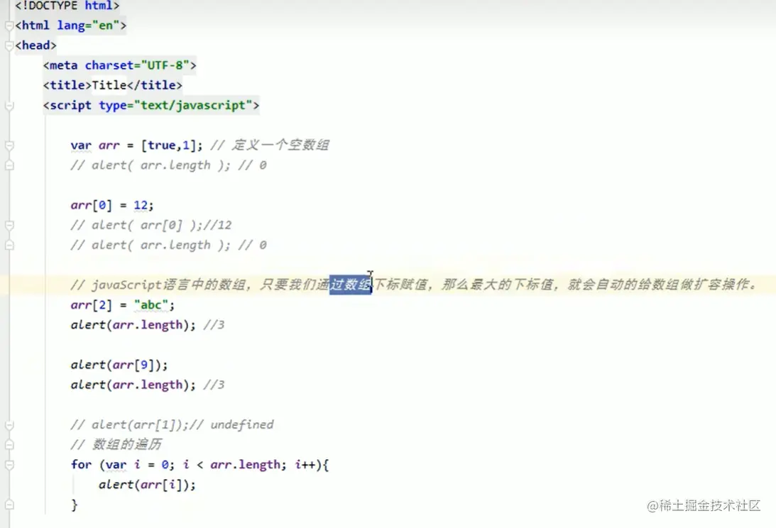 - JavaScript的数组,只要我们通过数组下标进行赋值,那么最大的下标值,就会自动地给数组做扩容操作