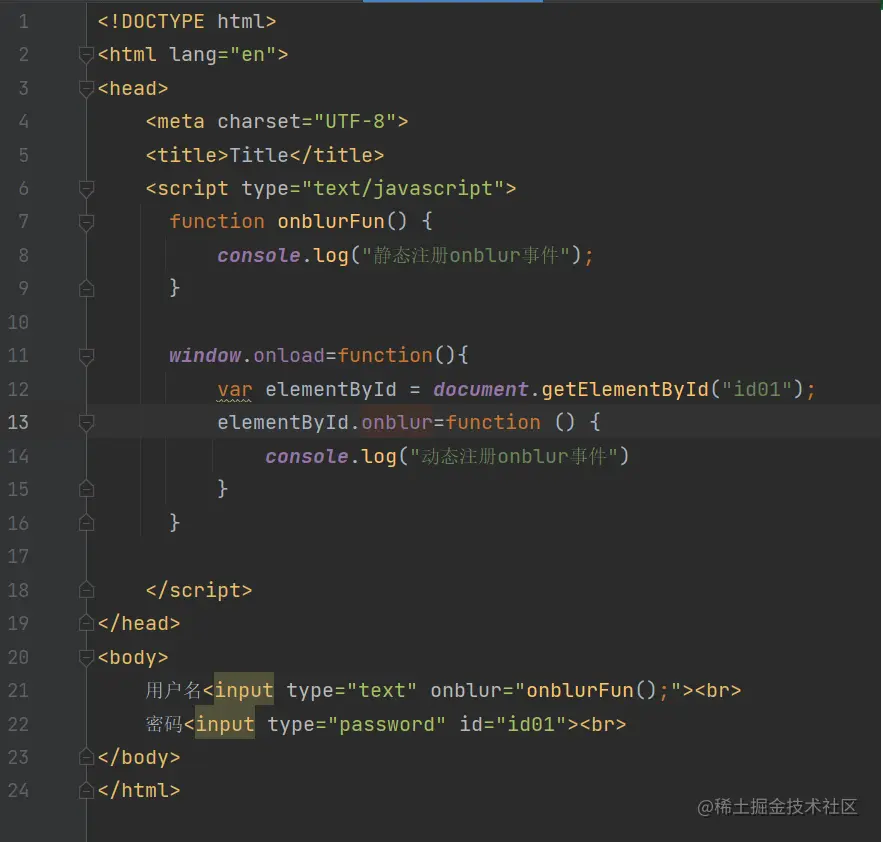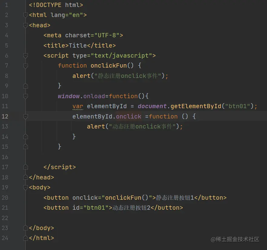 - 是指先通过js代码得到标签的dom对象,然后再通过 对象.事件名 = function(){}