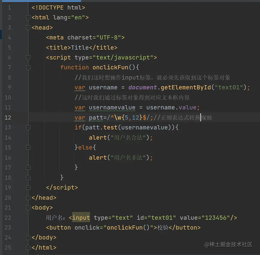 需求:当用户点击“校验”按钮时,获取输入框的内容,验证其是否合法(规则是由字母或数字或下划线组成且长度为5—12)