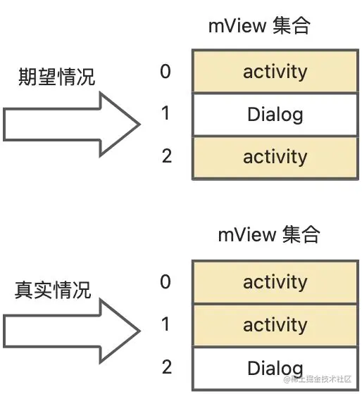 - 第一种方案会判断失败,因为这时候的弹窗 View 在第一个 Activity 与 第二个 Activity 之间,所以,第二个 Activity 无法通过区间的方式判断到是否有弹窗