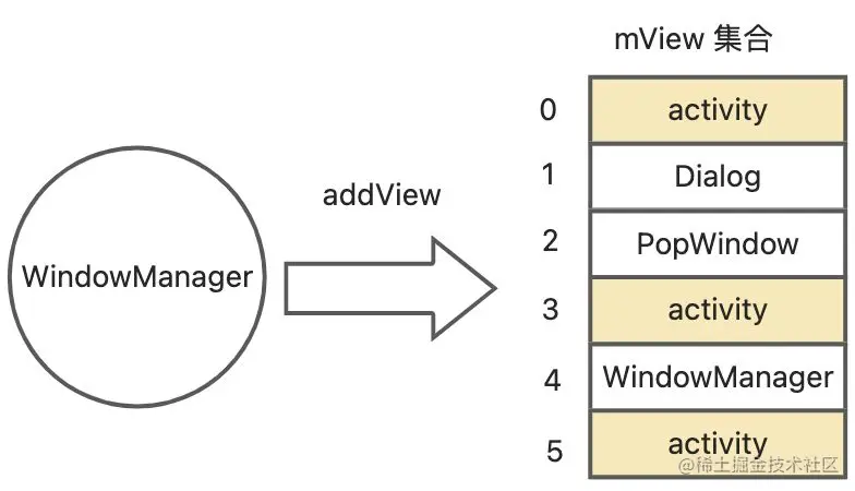 从上面我们可以简单了解到,当前进程所有窗口 View,最终都会被存储到 WindowManagerGlobal 单例的 mViews 集合中,那我们是不是可以从 mView 这个集合入手?我们来简单画个 mView 的存储图: