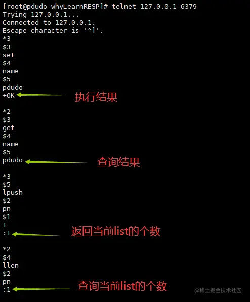 我们已经学习了相关的RESP协议,那么我们如何学习呢? 我们可以使用telnet命令来操作即可。