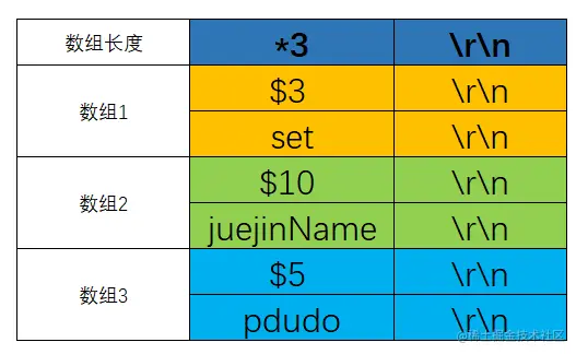 那我们来解释一下*3代表有3个数组,而$3代表复杂字符串有长度为3,值为set, $10代表复杂字符串长度为10,值为juejinName, $5代表复杂字符串长度为5,值为pdudo。