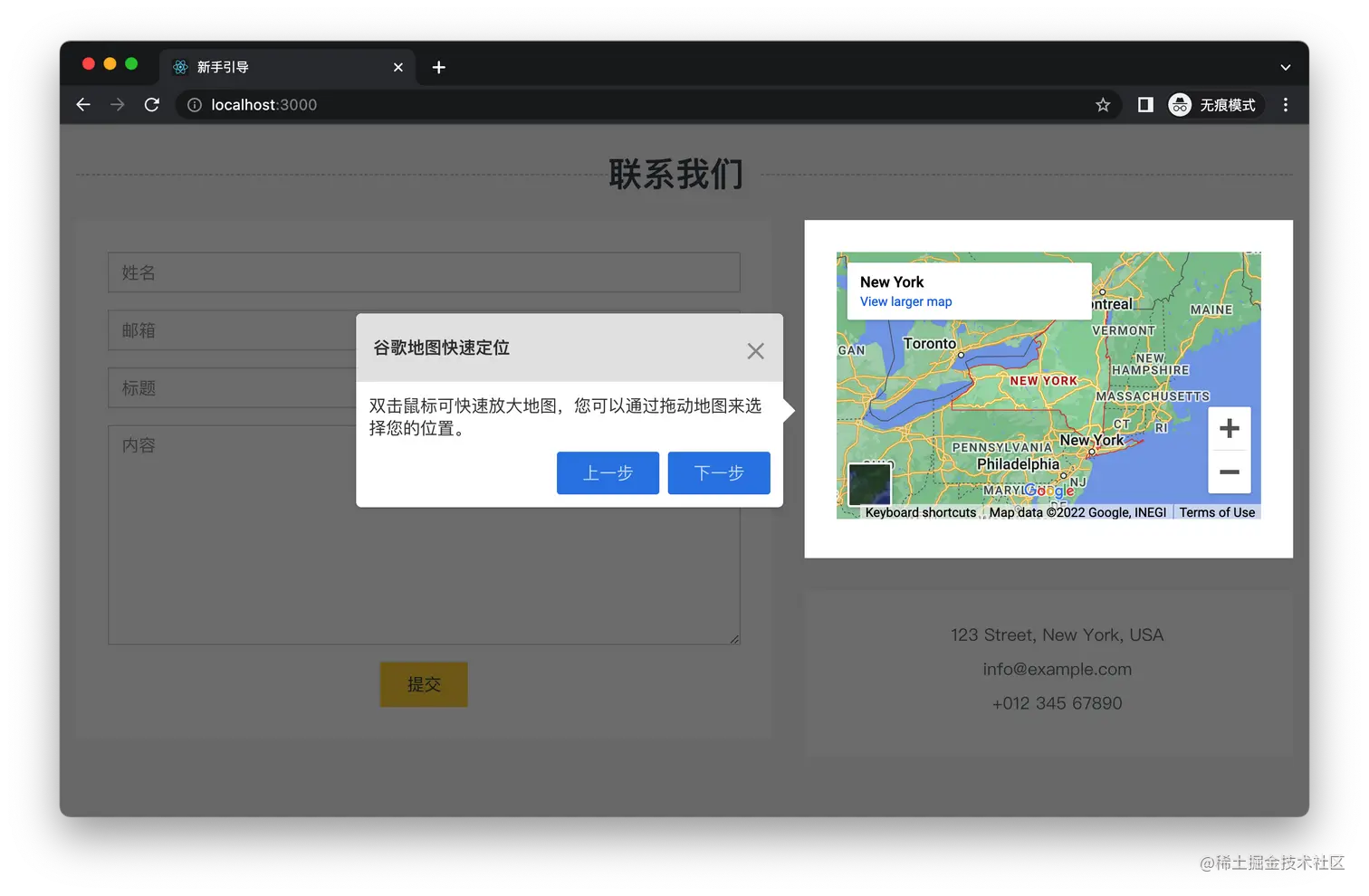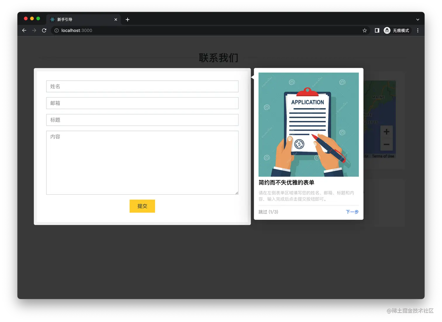 这个库也有非常强的 UI 定制能力,配置项也不复杂,跟 reactour 的思想非常接近,基本上可以满足所有项目的需求了,而且默认自带气泡箭头,如下图所示: