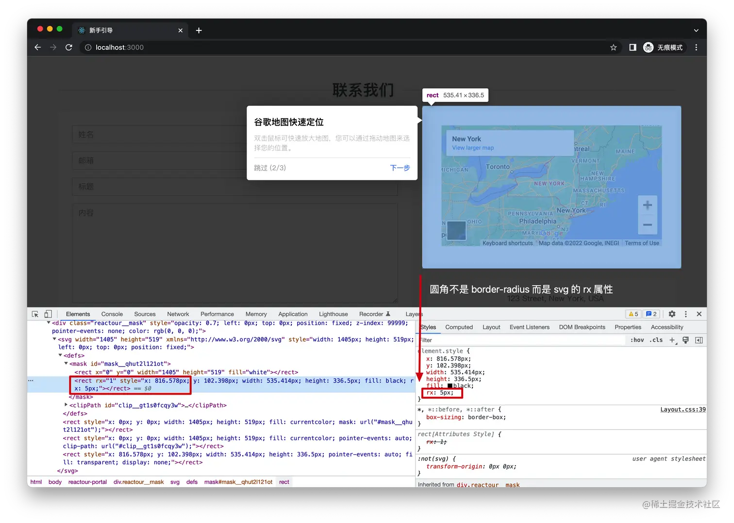 有一点需要注意,它的默认遮罩的高亮区域是用 svg 做的,不能用 borderRadius 控制圆角,要用 rx 来控制才行: