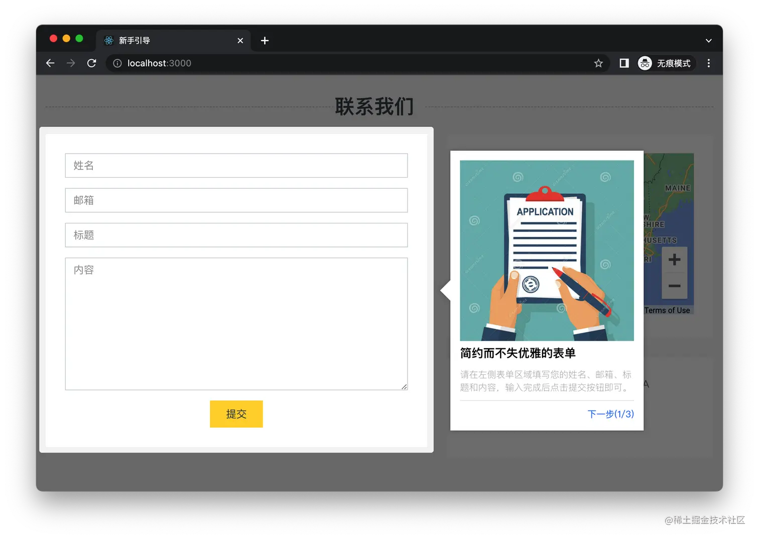 <div className="guide-content">请在左侧表单区域填写您的姓名、邮箱、标题和内容,输入完成后点击提交按钮即可。</div>