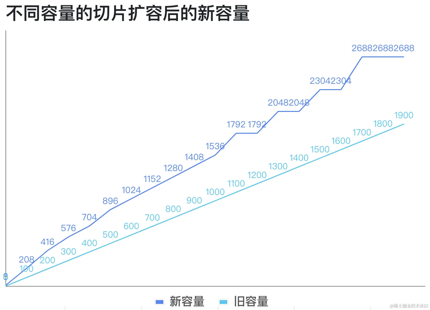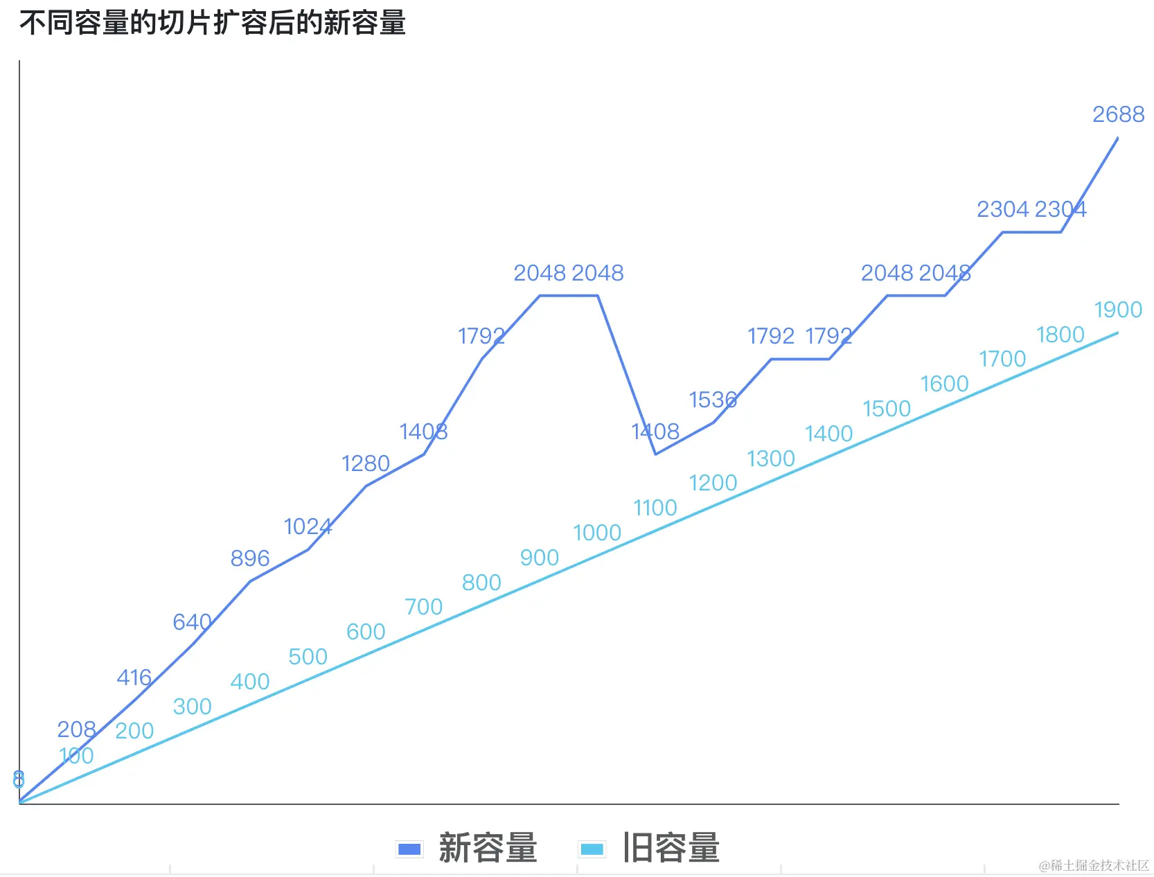 我们注意到,在slice的容量刚刚触发大于1024增长1.25倍这个条件的时候,计算出来的新容量要小于之前计算出的容量,我绘制了一张图表,你可以感受一下:
