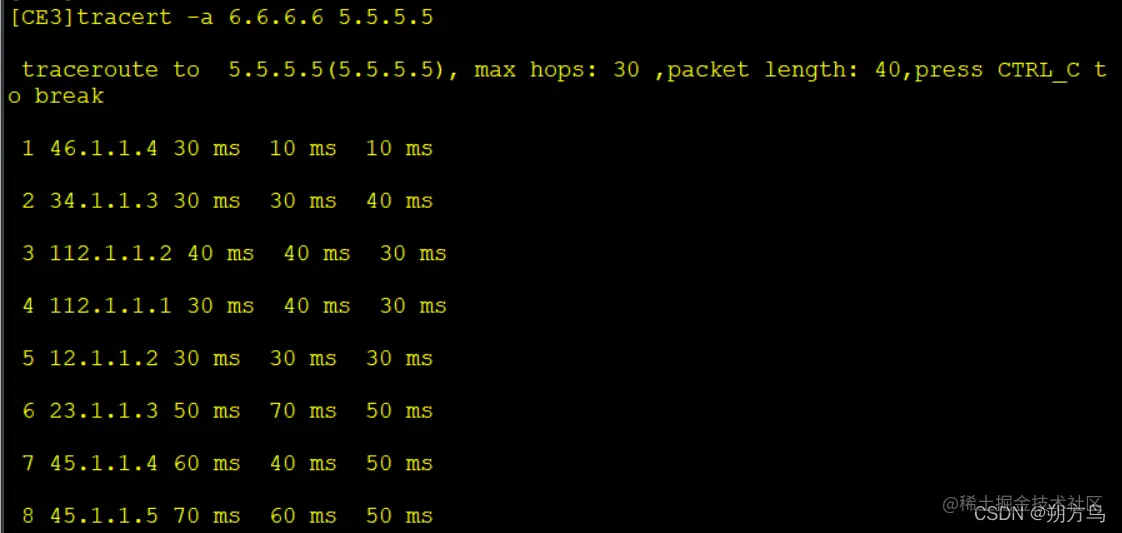 从CE3上 tracert CE2 发现经过了CE1,实验成功。