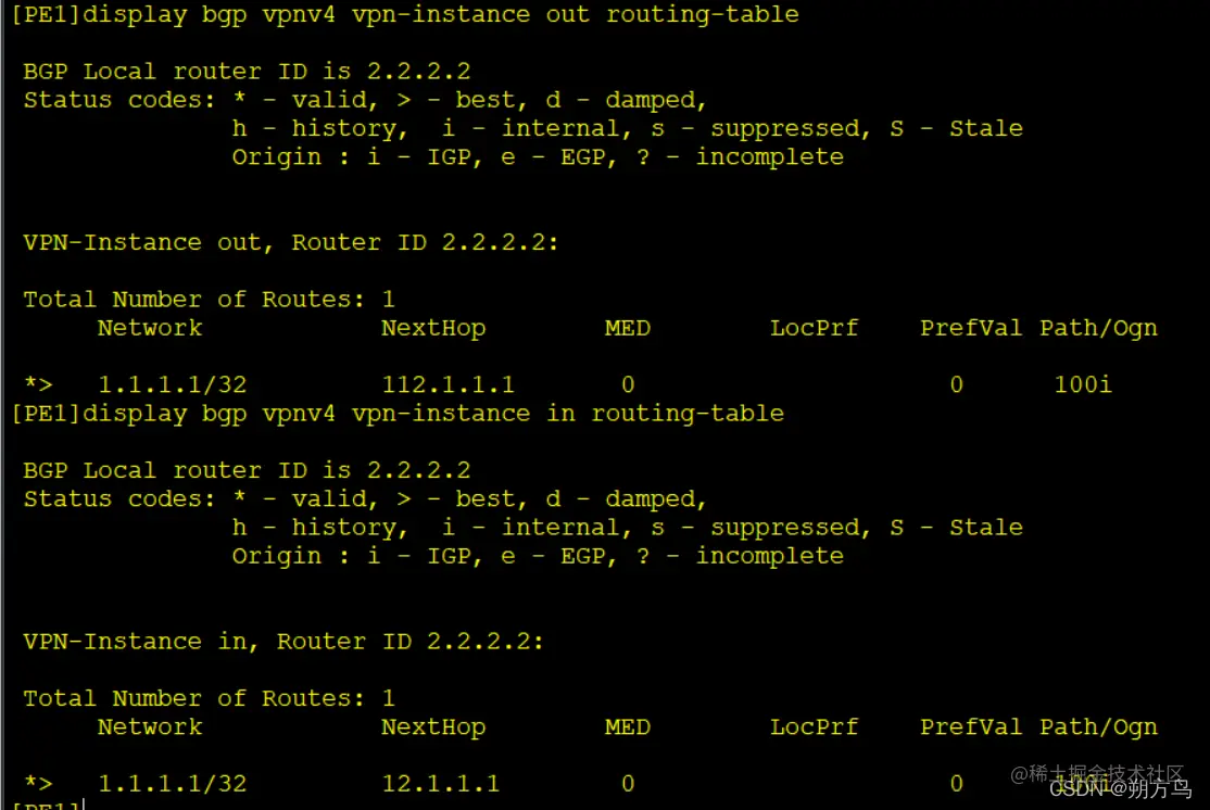 效果验证:PE1的out和in实例均有了1.1.1.1的路由