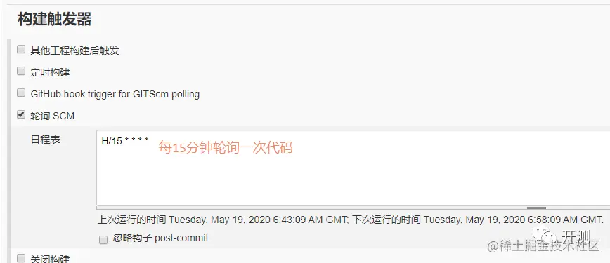 我的代码托管在gitlab中,我希望在代码有更新时自动触发构建,所以选择了“轮询SCM”。