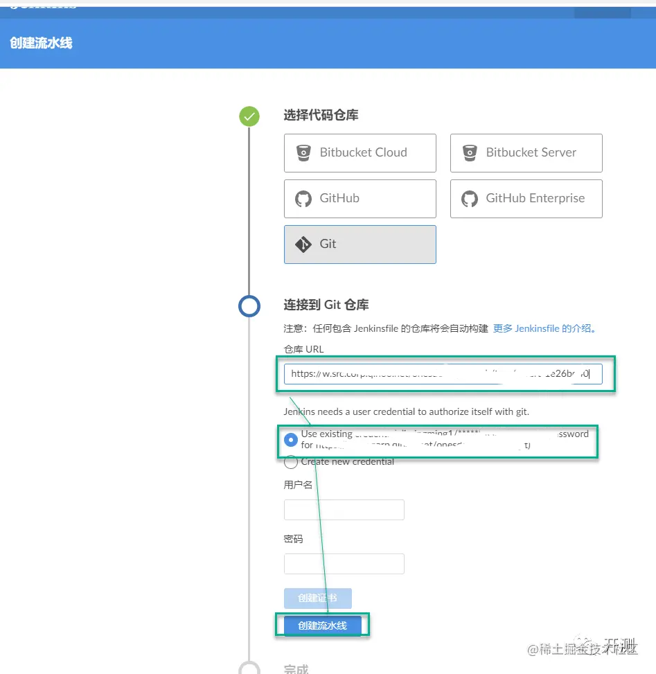 选择代码仓库,填入地址和令牌,创建一条流水线。