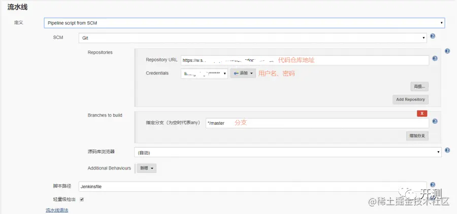 我使用的是【PipelinescriptfromSCM】,只添加了代码仓库地址和令牌信息,其余保持默认。