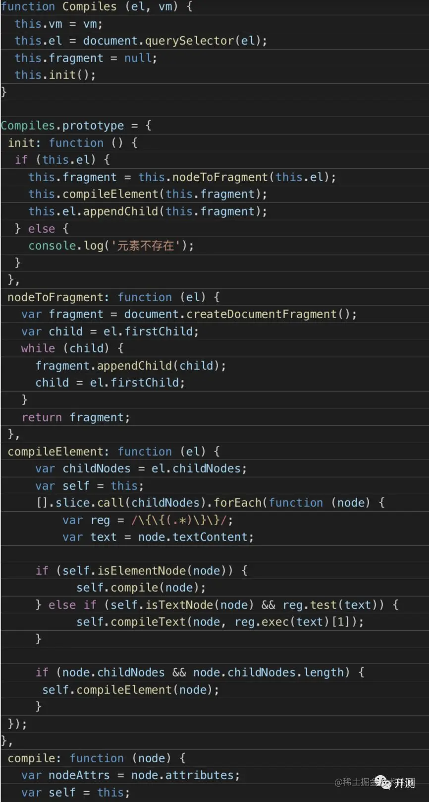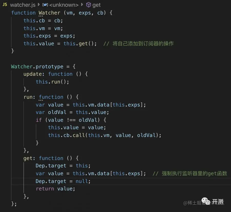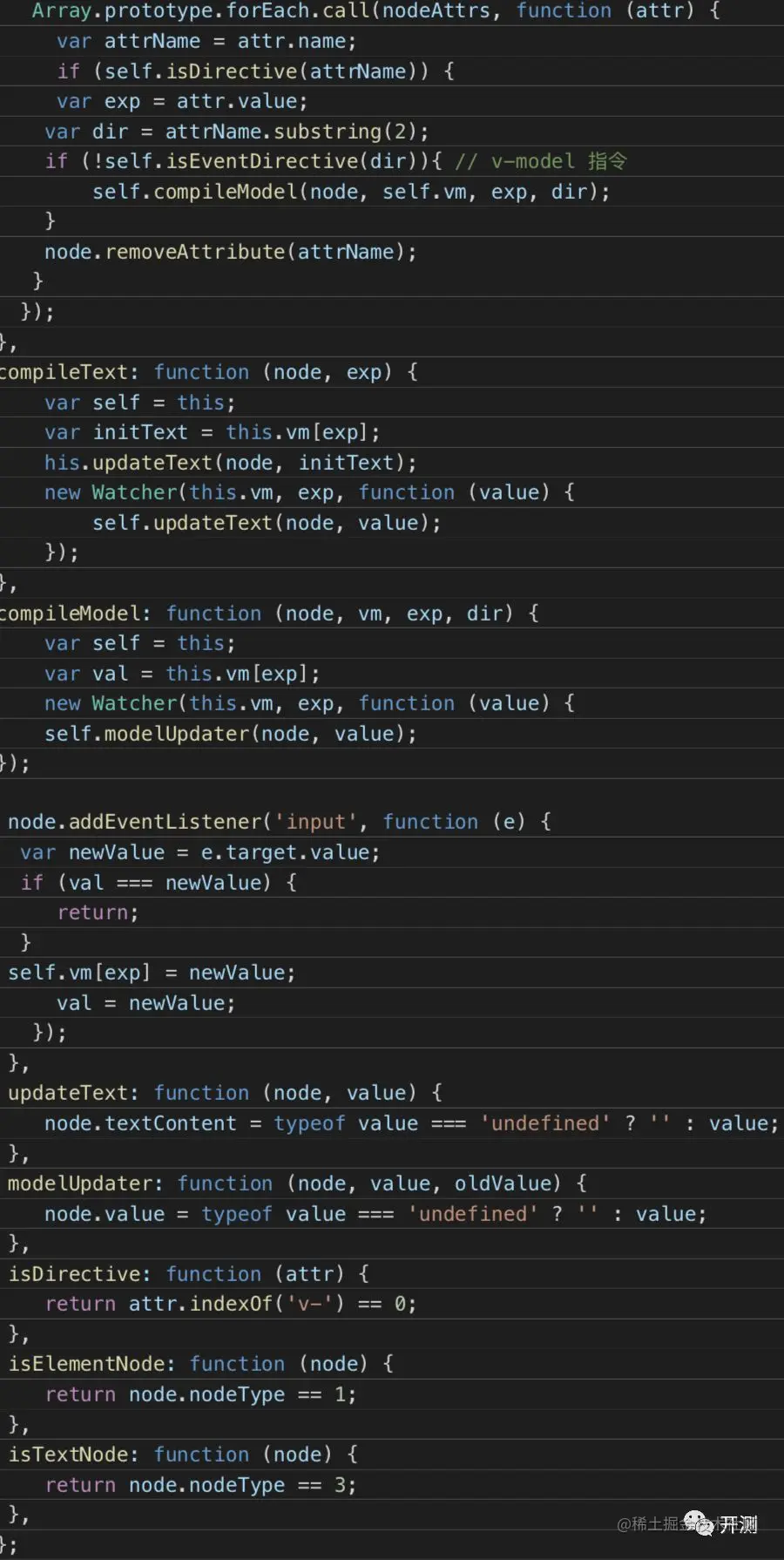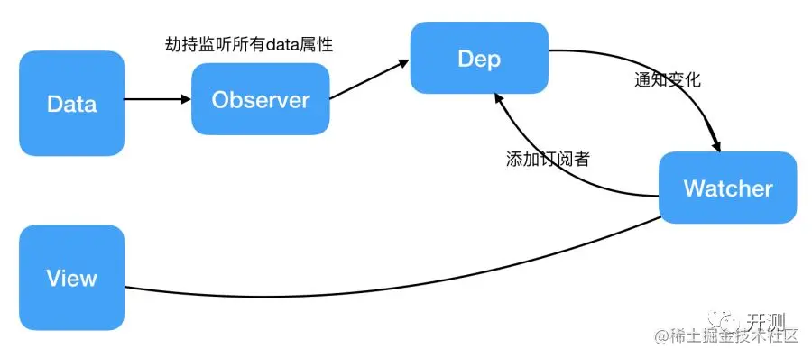 数据的双向绑定,首先要对数据进行劫持监听,所以我们需要设置一个监听器Observer,用来监听所有属性。如果属性发生变化了,就需要告诉订阅者Watcher看是否需要更新。因为订阅者是有很多个,所以需要有一个消息订阅器Dep来专门收集这些订阅者,然后在监听器Observer和订阅者Watcher之间进行统一管理的。还需要有一个指令解析器Compile,对每个节点元素进行扫描和解析,将相关指令对应初始化成一个订阅者Watcher,并替换模板数据或者绑定相应的函数,此时当订阅者Watcher接收到相应属性的变化,就会执行对应的更新函数,从而更新视图。