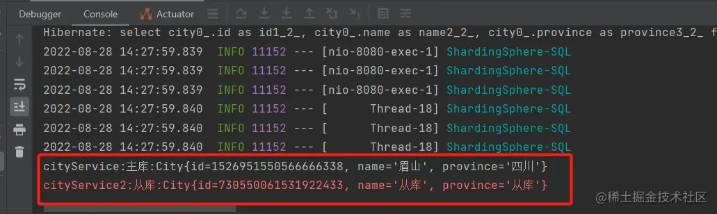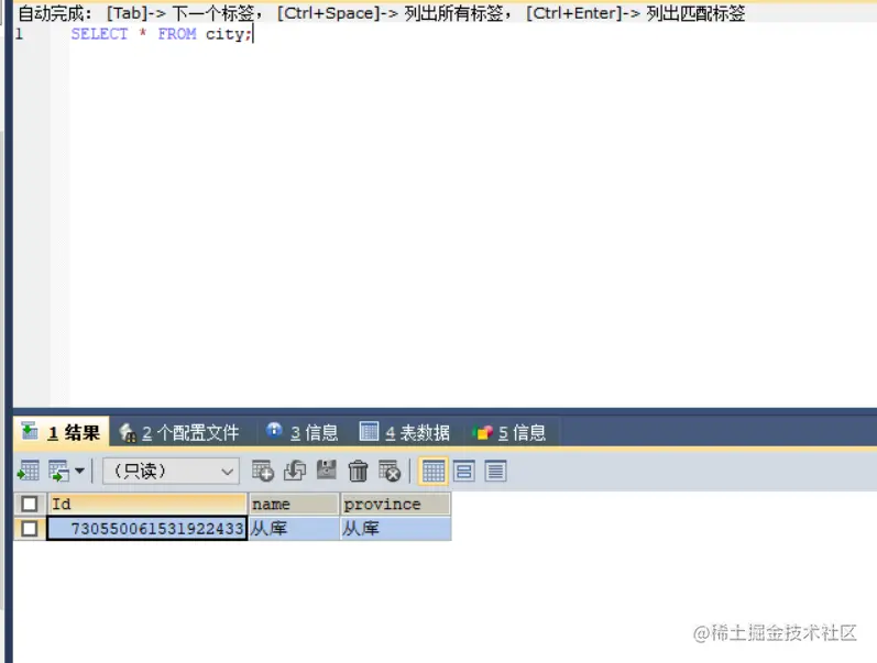 实验分析: 我们对 city 表进行插入后,紧接着对 city 表进行了查询,查出的内容是我们刚刚插入的内容。说明查询操作没有走读库,而是走了主库。