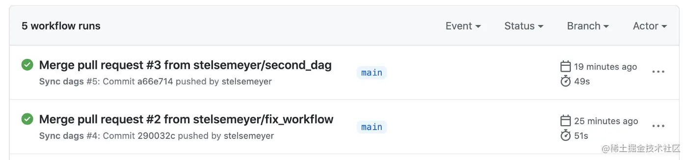 通过GitHub上的Workflow 标签,我们可以查看工作流程的状态。每当我们合并到main ,文件就会被同步到S3,我们应该能在几秒钟内看到Airflow用户界面上的更新DAG(你可能需要点击刷新按钮)。