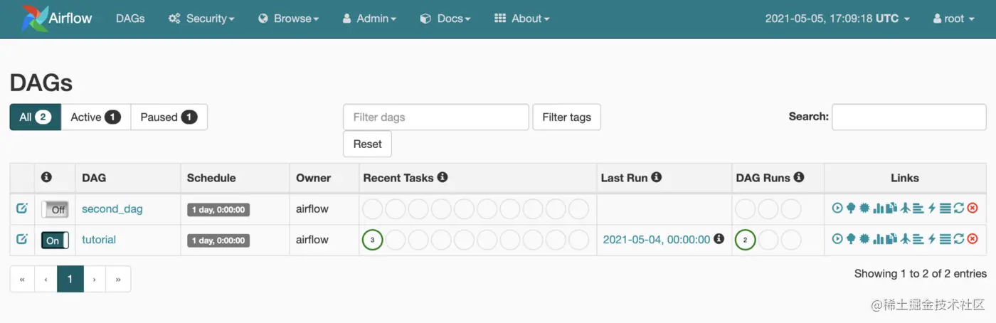 我们应该看到Airflow UI,包括dags 文件夹中的两个DAG,这些DAG最初是由Terraform上传到S3的。