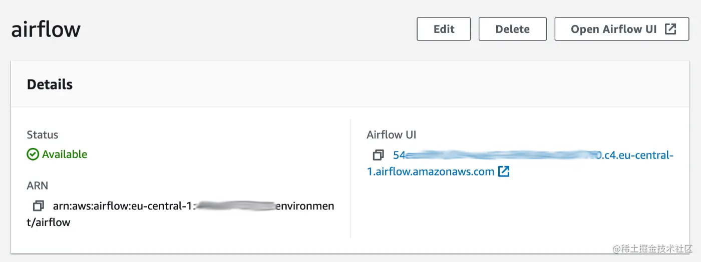 AWS控制台中的亚马逊管理的工作流程,包括Airflow用户界面的URL - 图片由作者完成。