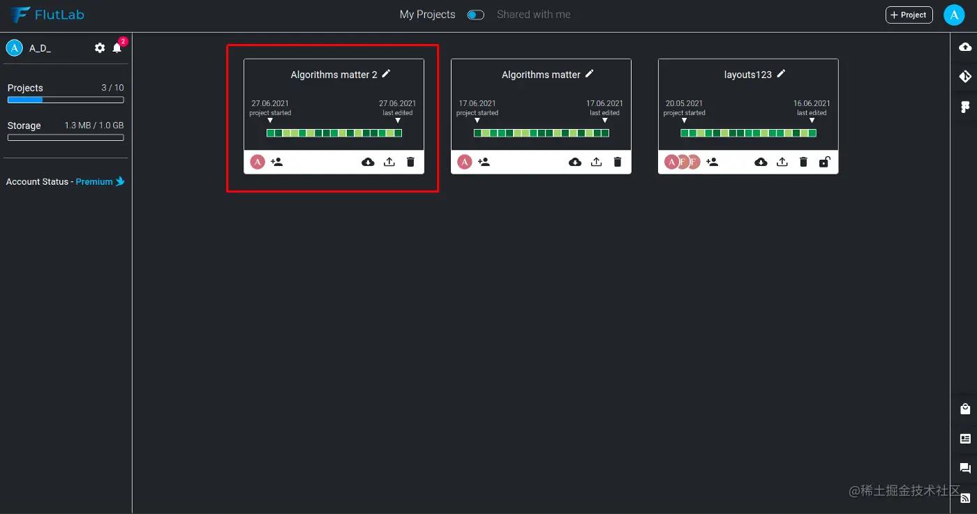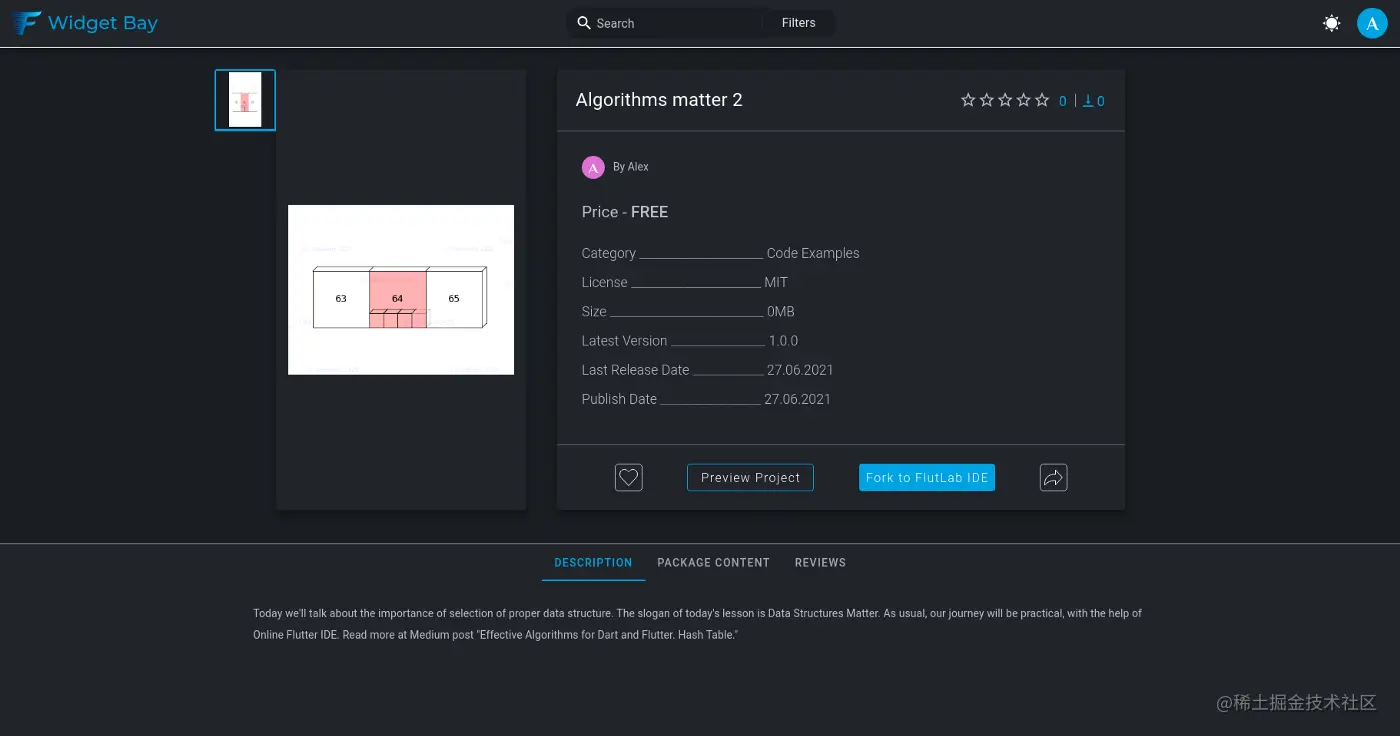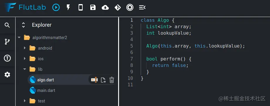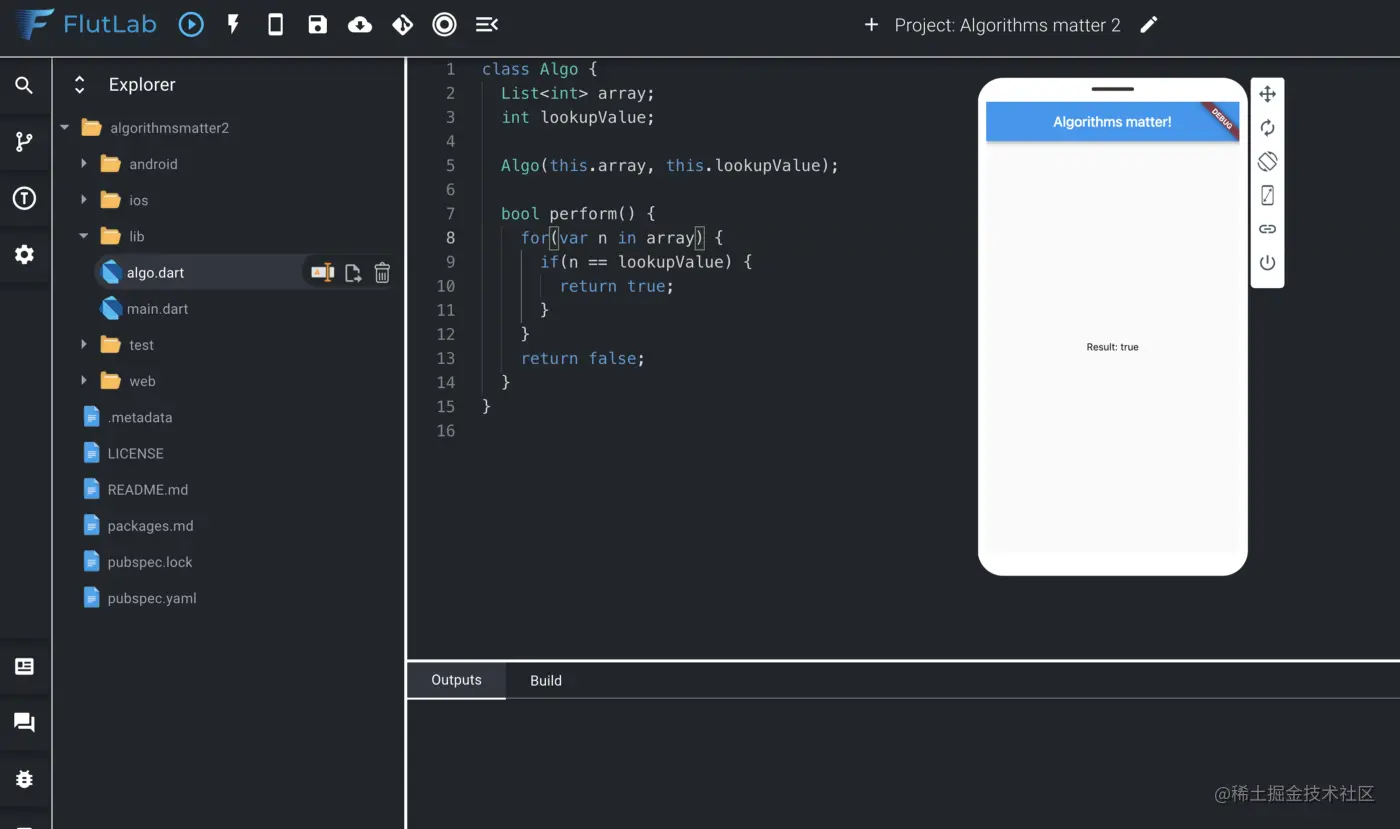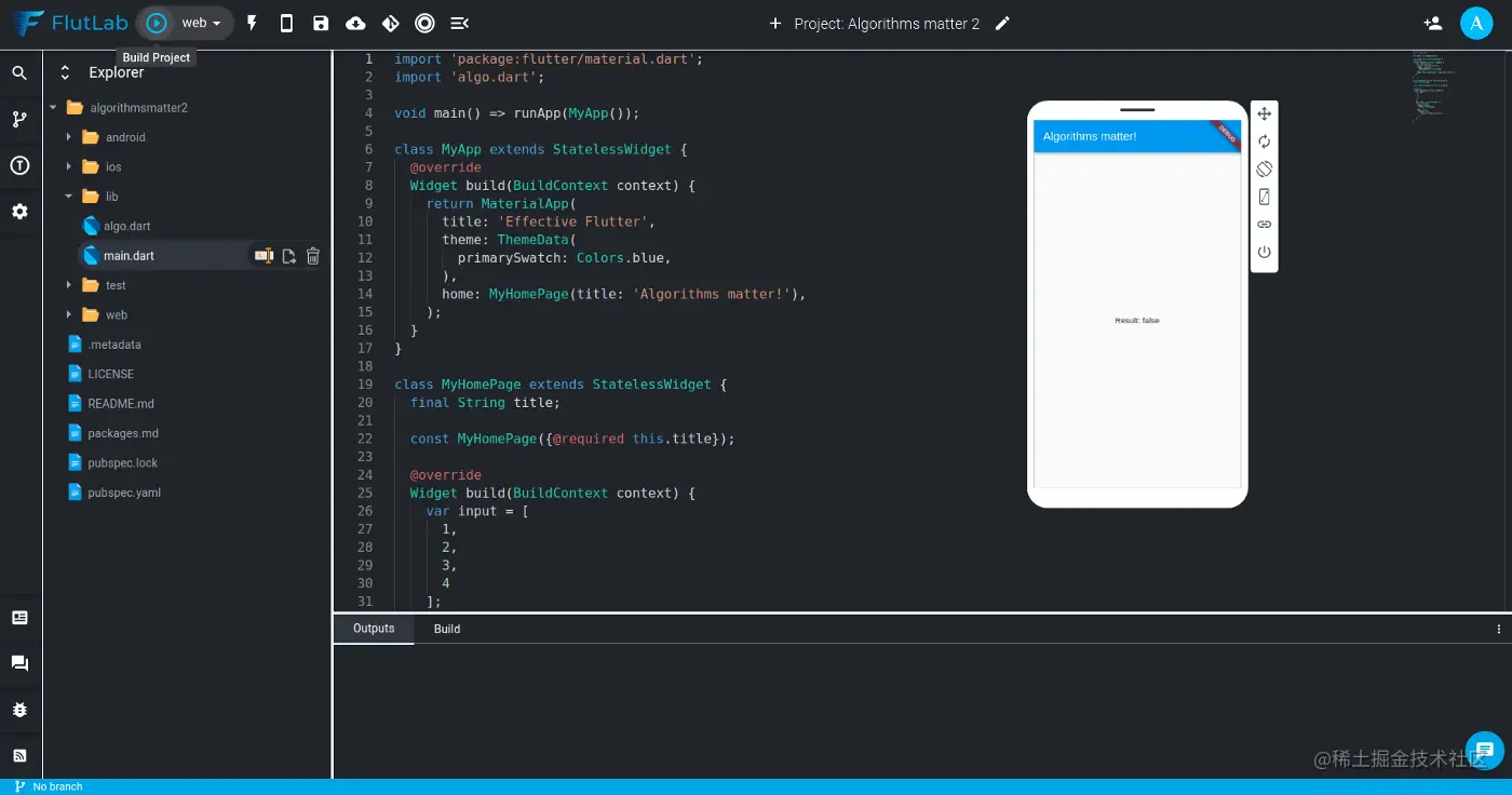 点击 "Fork to FlutLab IDE"。你现在应该在你的仪表板上看到一个名为 "Algorithms matter 2 "的新Flutter项目。