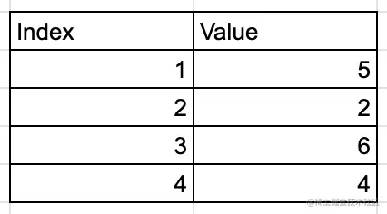 但是在深入研究哈希集之前,让我们从另一个角度来看看列表数据结构。我们把它叫做索引表。我们可以把一些列表,比如**[5, 2, 6, 4]画成一个有两列的表:索引和值**。