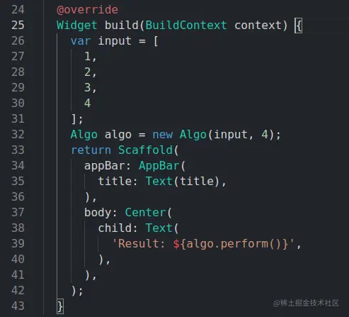 然后,我们的应用程序将algo.perform()的结果渲染在应用程序屏幕中央的文本内。老实说,它的搜索工作做得很差--它说在数组[1, 2, 3 ,4]中没有找到数字4。