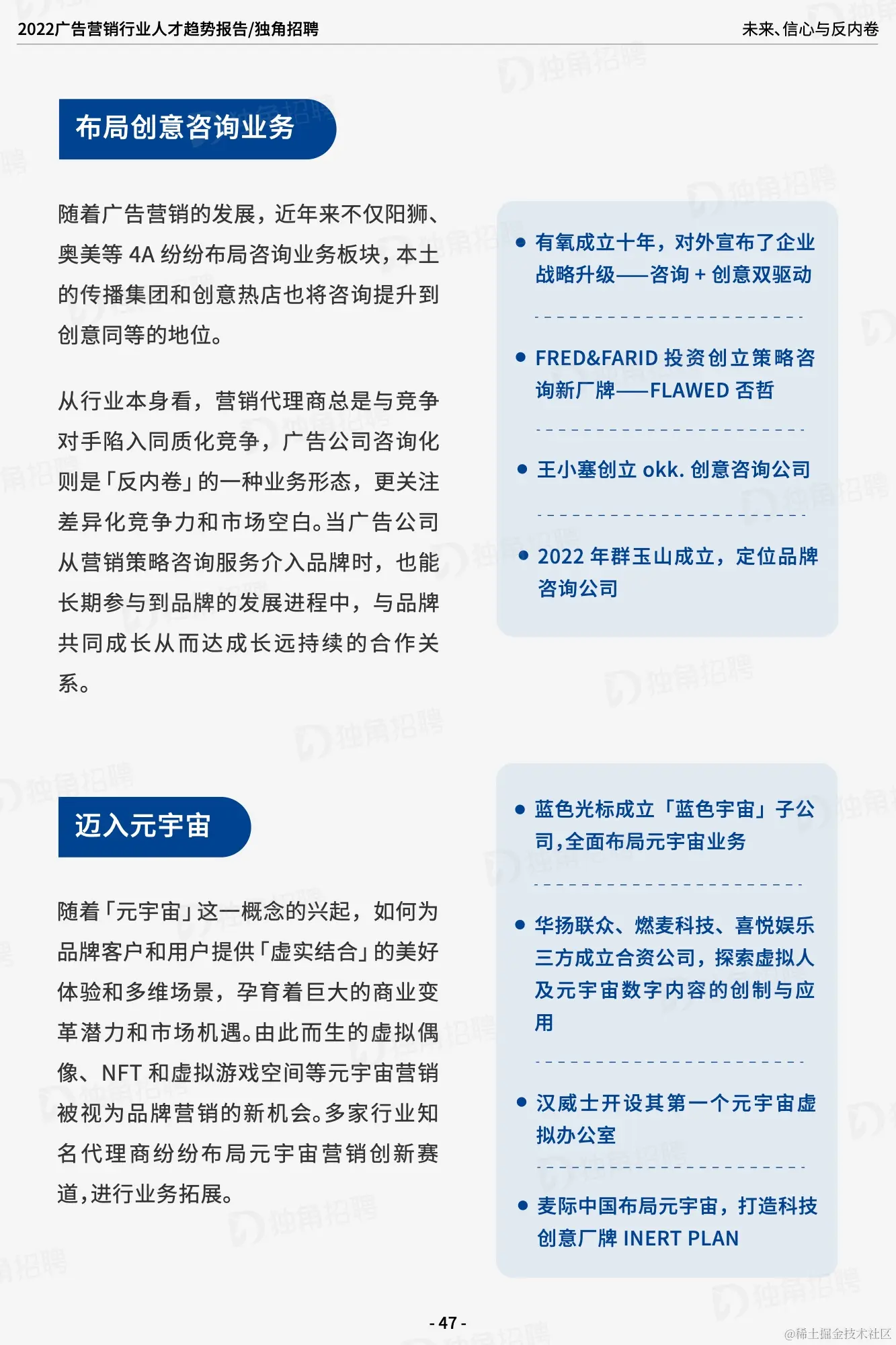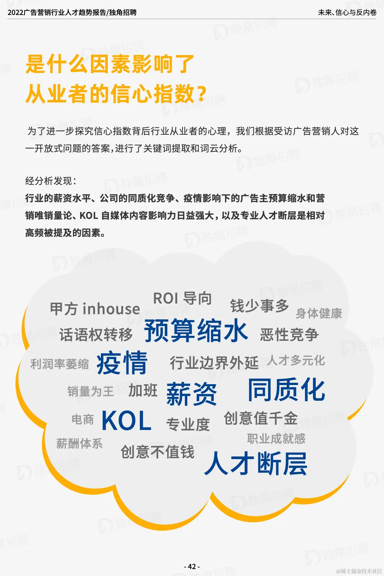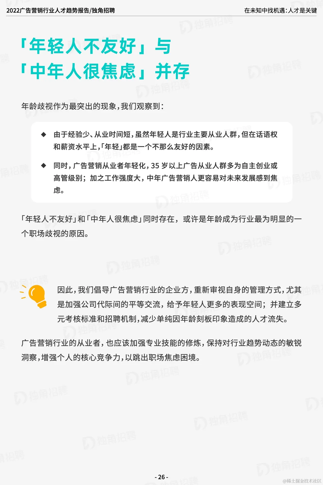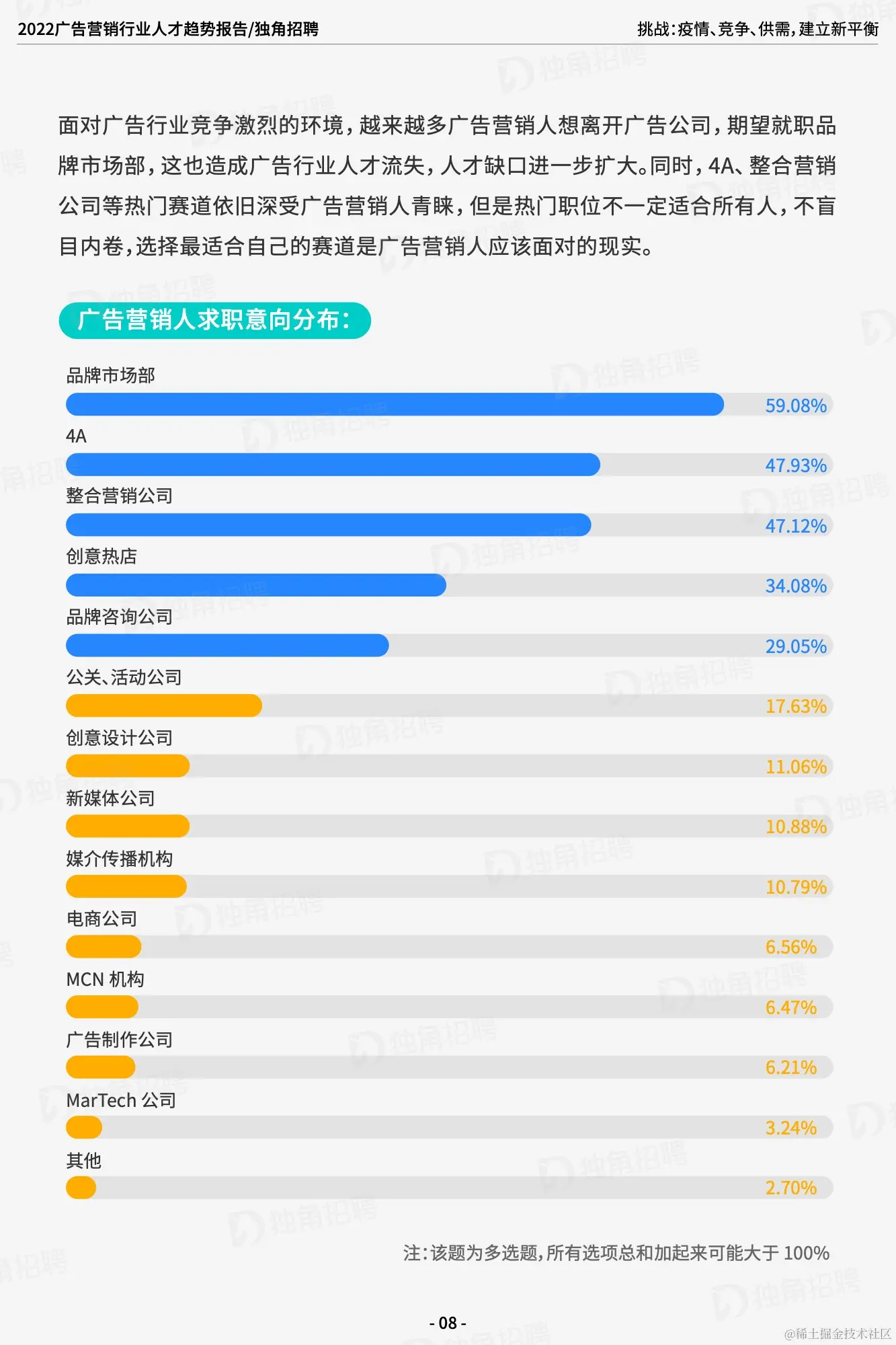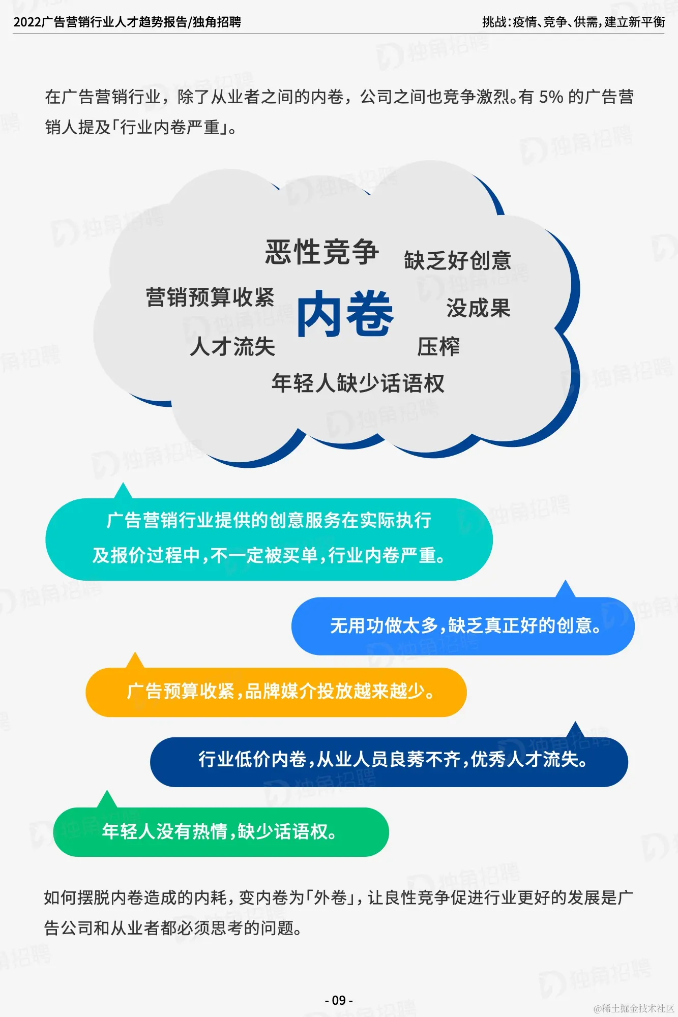 「求职难」和「招人荒」并存是现状。当然,随着疫情防控逐渐常态化,对于疫情带来的冲击也变得可以预期并有所准备,一时的挑战也是行业重新洗牌,自我革新的新机会。广告营销行业始终给人以「跳槽多」的固有标签,如何摆脱内卷造成的内耗,变内卷为「外卷」,让良性竞争促进行业更好的发展是广告公司和从业者都必须思考的问题。