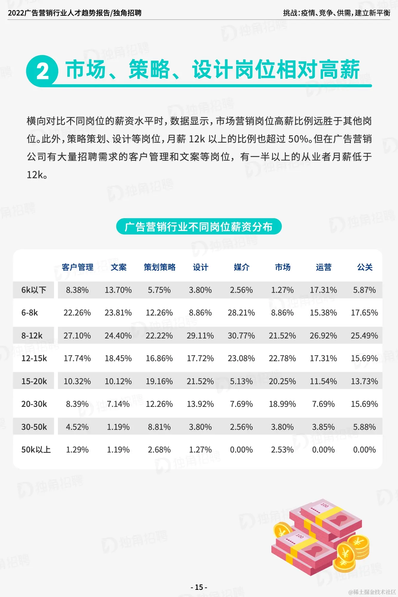 横向对比不同岗位的薪资水平时,数据显示,市场营销岗位高薪比例远胜于其他岗位。此外,策略策划、设计等岗位,月薪 12k 以上的比例也超过 50%。但在广告营销公司有大量招聘需求的客户管理和文案等岗位,有一半以上的从业者月薪低于12K。在今年的薪资调查中发现,超过 50%的广告营销人今年薪资降薪或持平。由于疫情的影响,不少广告营销公司营收减少,导致难以提供给员工相对匹配的薪资。