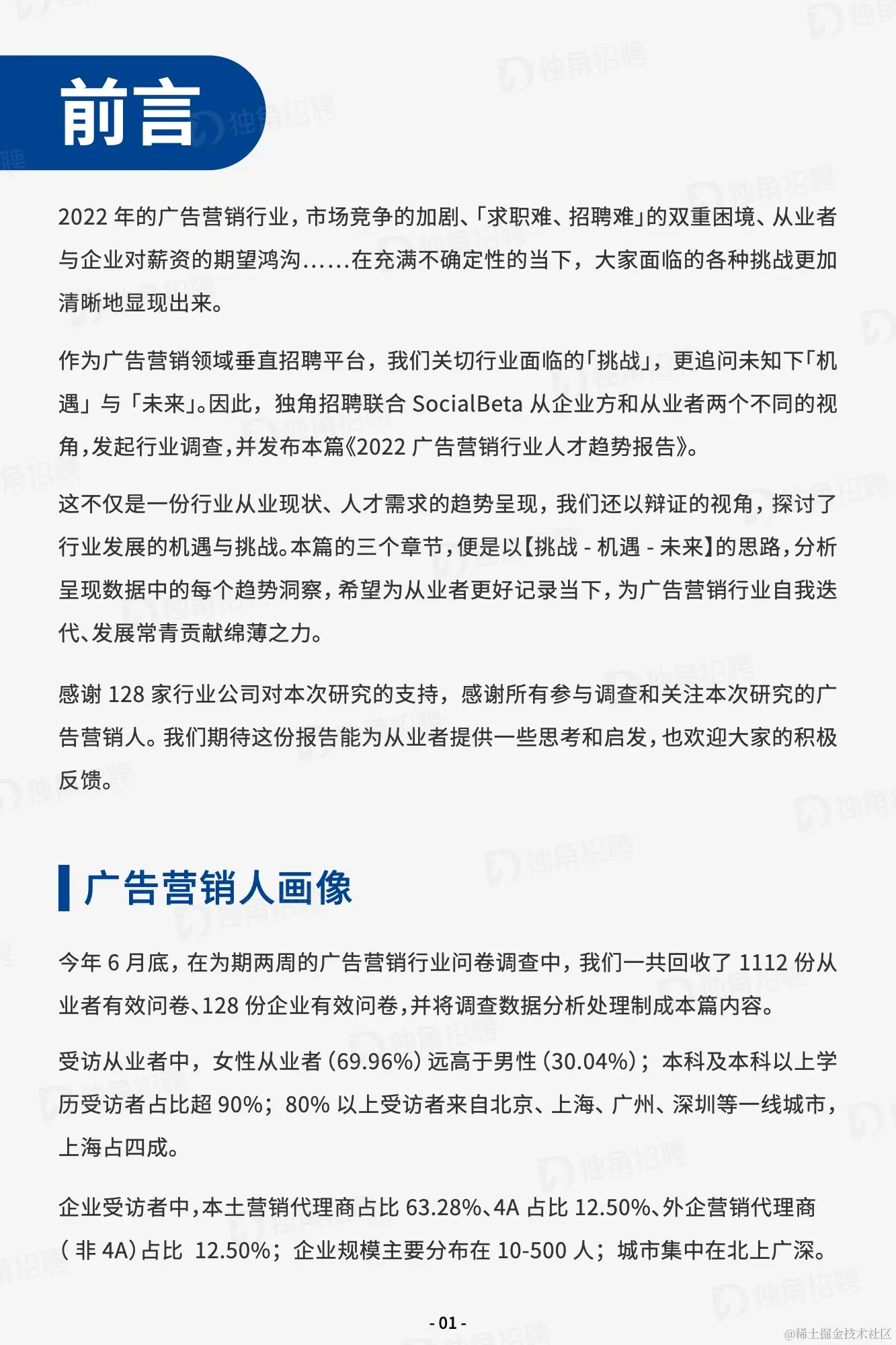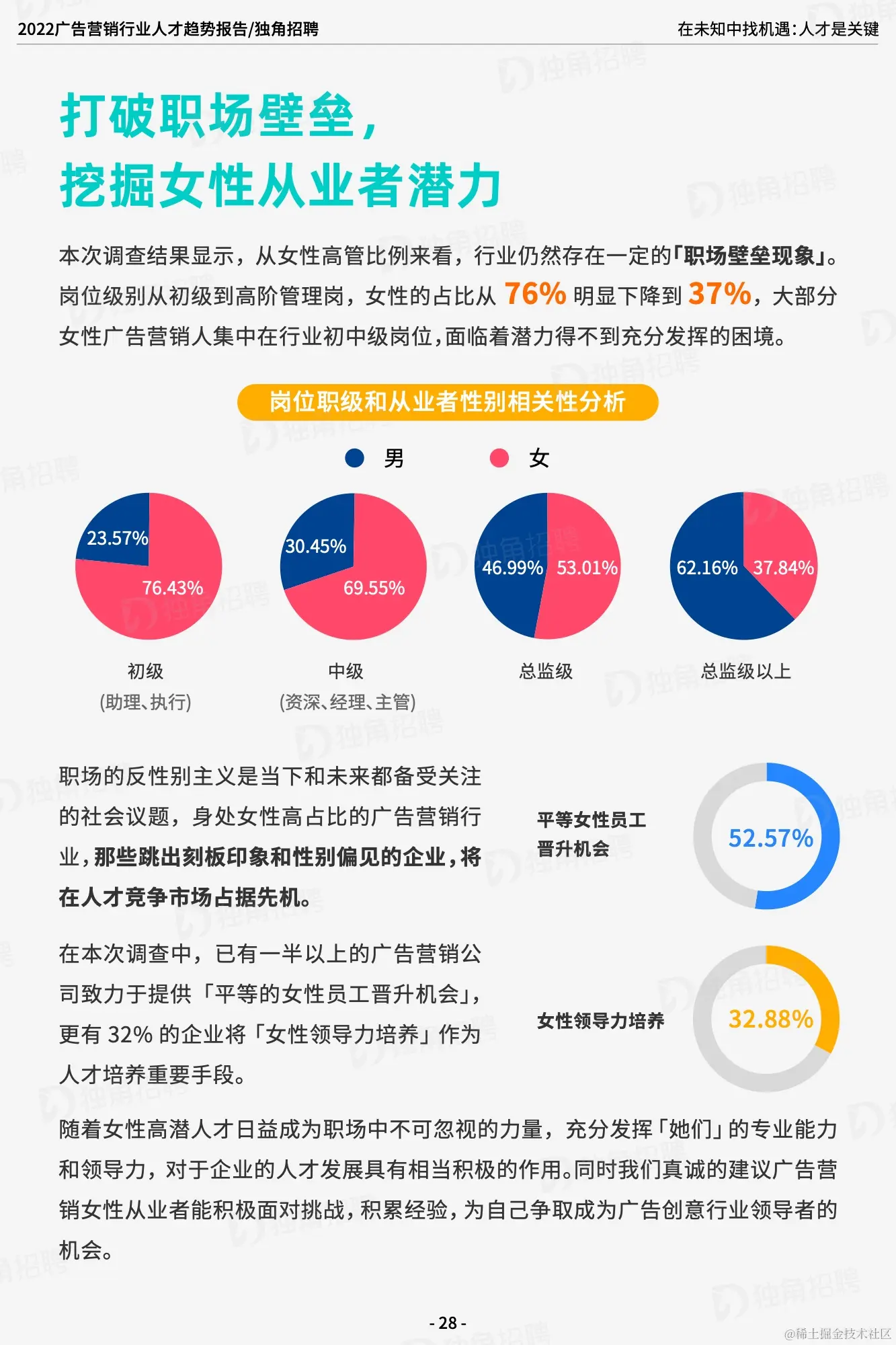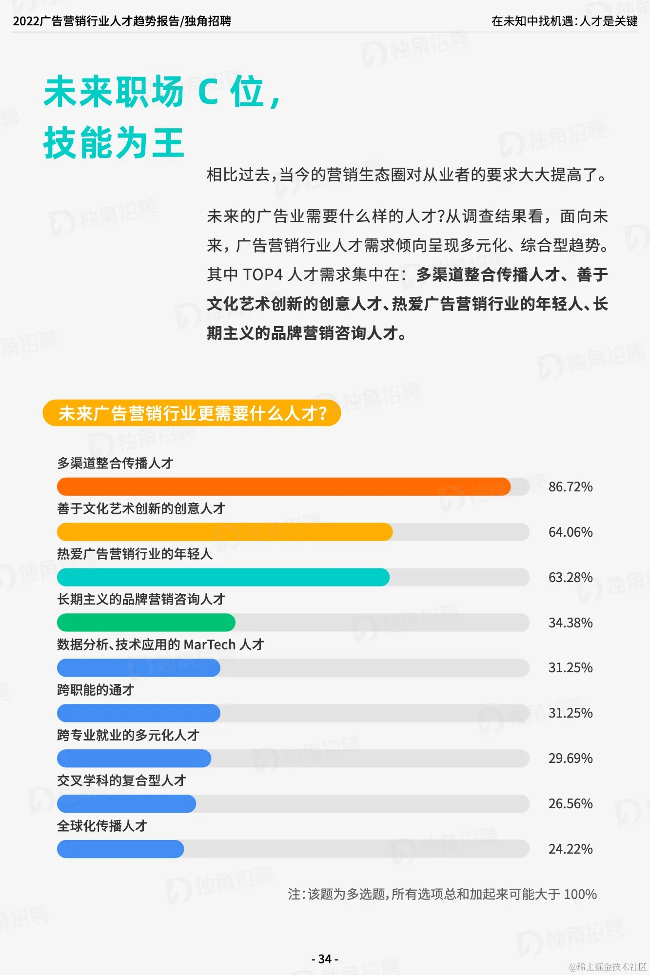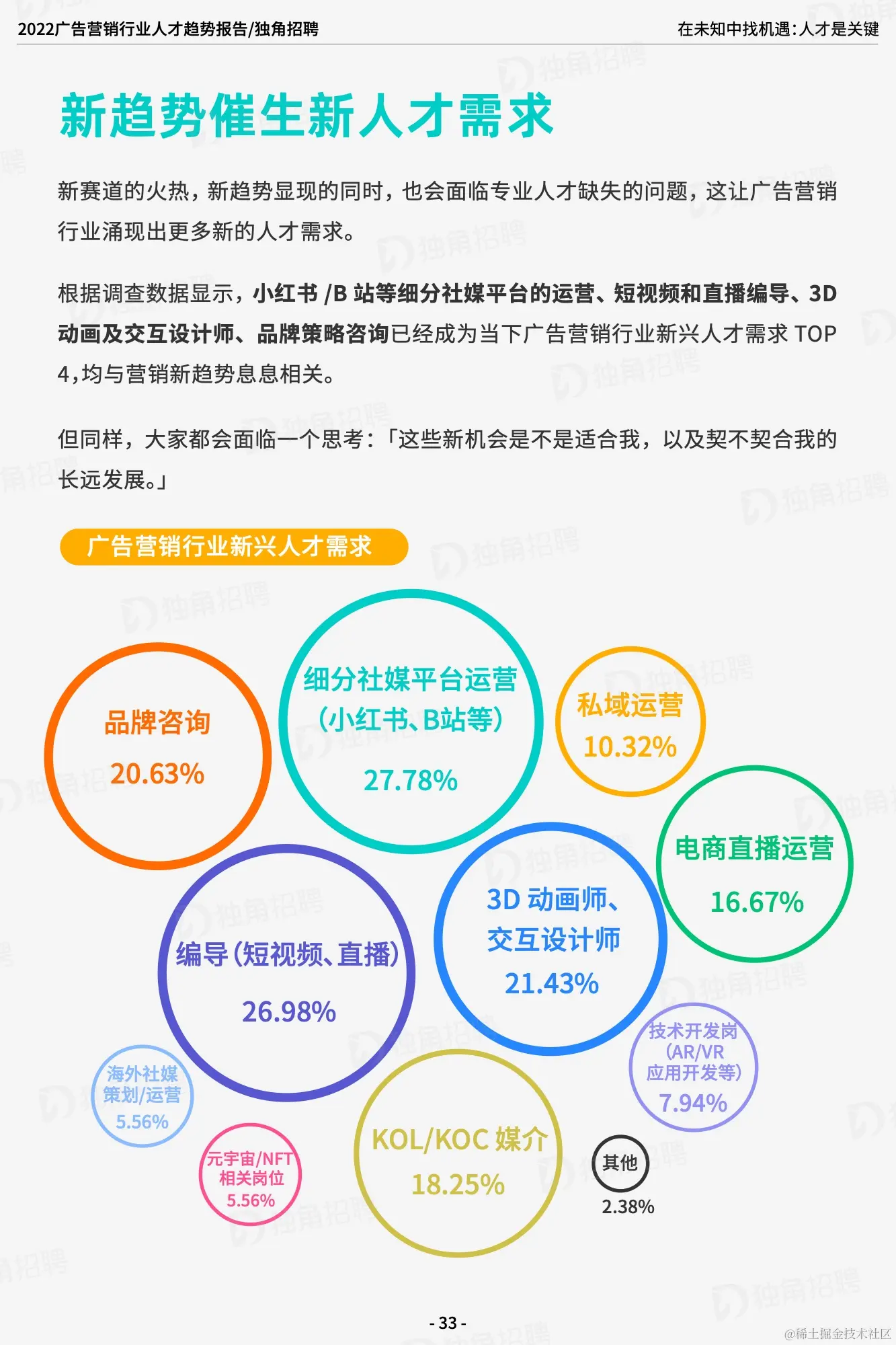 未来职场 C 位,技能为王;高成长性,才是核心竞争力。创意至上,咨询、技术等成为行业新增长点。灵活工作机制新流行,远程办公,或从应急走向日常。行业企业应打破职场壁垒,挖掘女性从业者潜力。根据调查数据显示,小红书/B 站等细分社媒平台的运营、短视频和直播编导、3D动画及交互设计师、品牌策略咨询已经成为当下广告营销行业新兴人才需求 TOP4,均与营销新趋势息息相关。