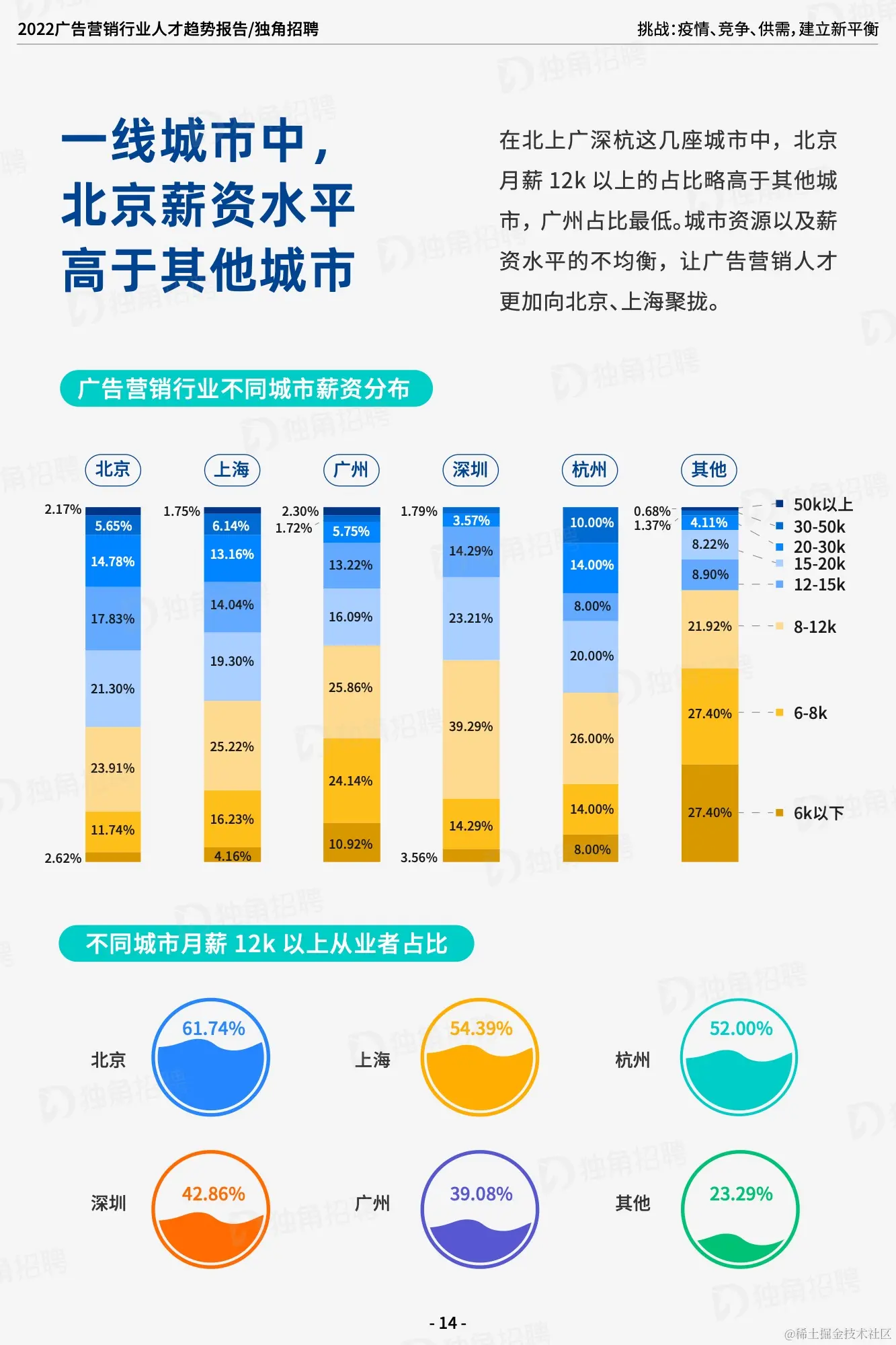 据调查显示,广告营销人月薪多集中在 8-15K 的范围区间,占比达到 43.44%,约一半的广告营销人月薪仍在 12k 以下,月薪在20k 以上的占 17% ,整体薪资范围分布不均。除固定月薪以外,广告营销人的薪资构成一般还包括年底双薪、年终奖、津贴、项目奖金等。值得注意的是,在以项目为考核标准的广告营销行业,只有约 21% 的人收到项目奖金;同时,在以「加班」著称的广告营销行业中,只有约 17% 的人薪资包含加班费。此外,还有 14% 的广告营销人只有固定月薪。在北上广深杭这几座城市中,北京月薪 12k 以上的占比略高于其他城市,广州占比最低。城市资源以及薪资水平的不均衡,让广告营销人才更加向北京、上海聚拢。