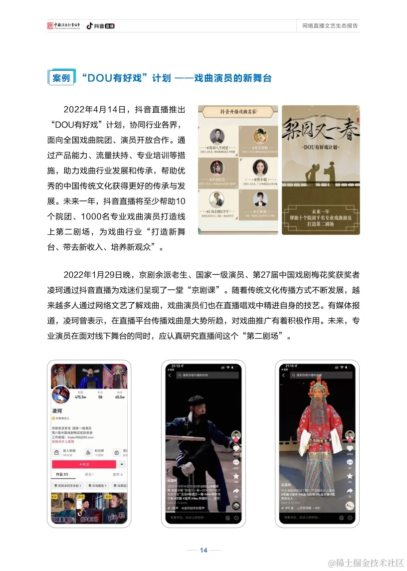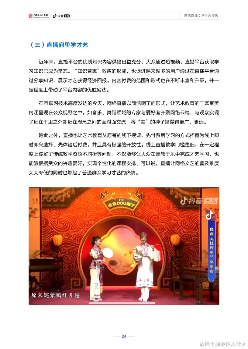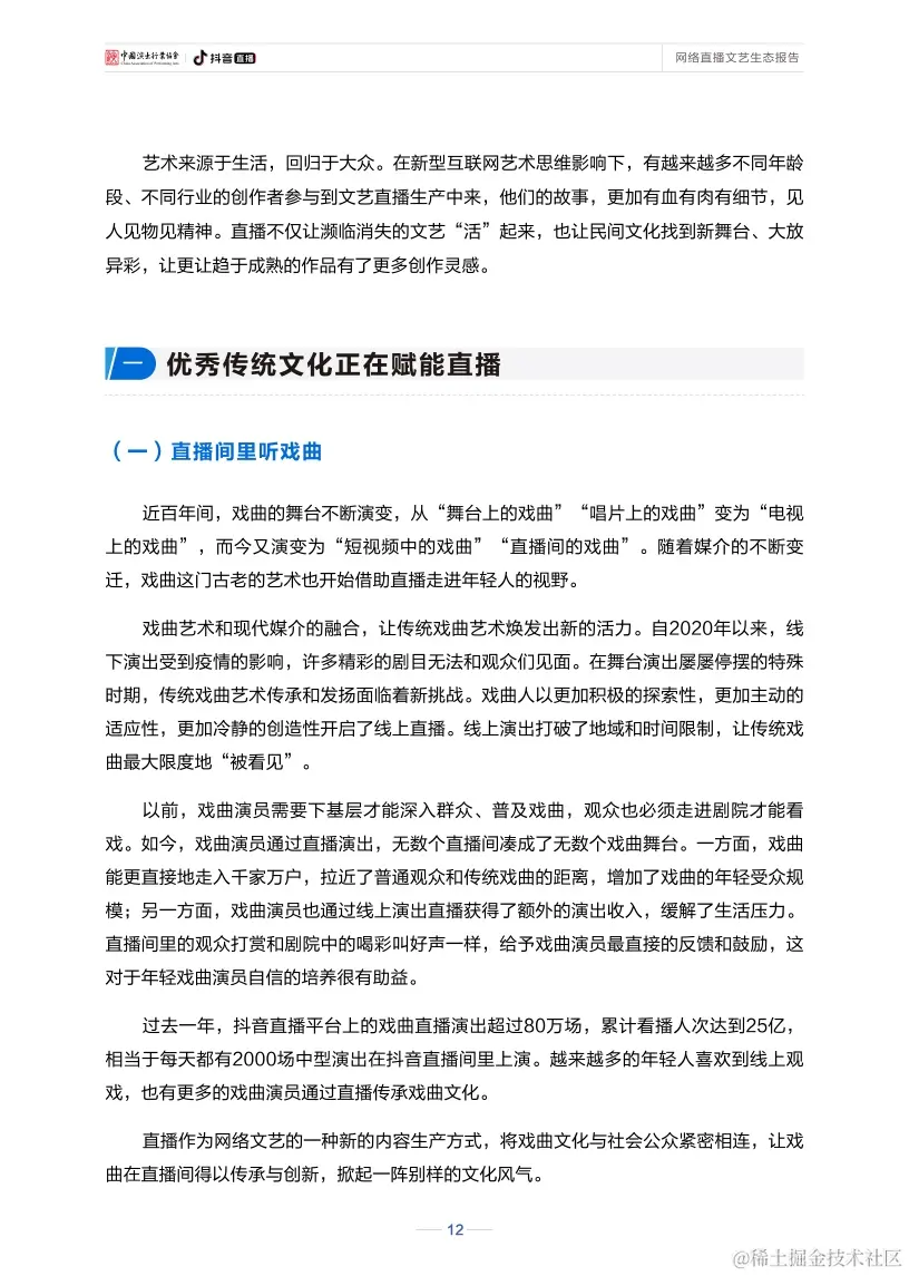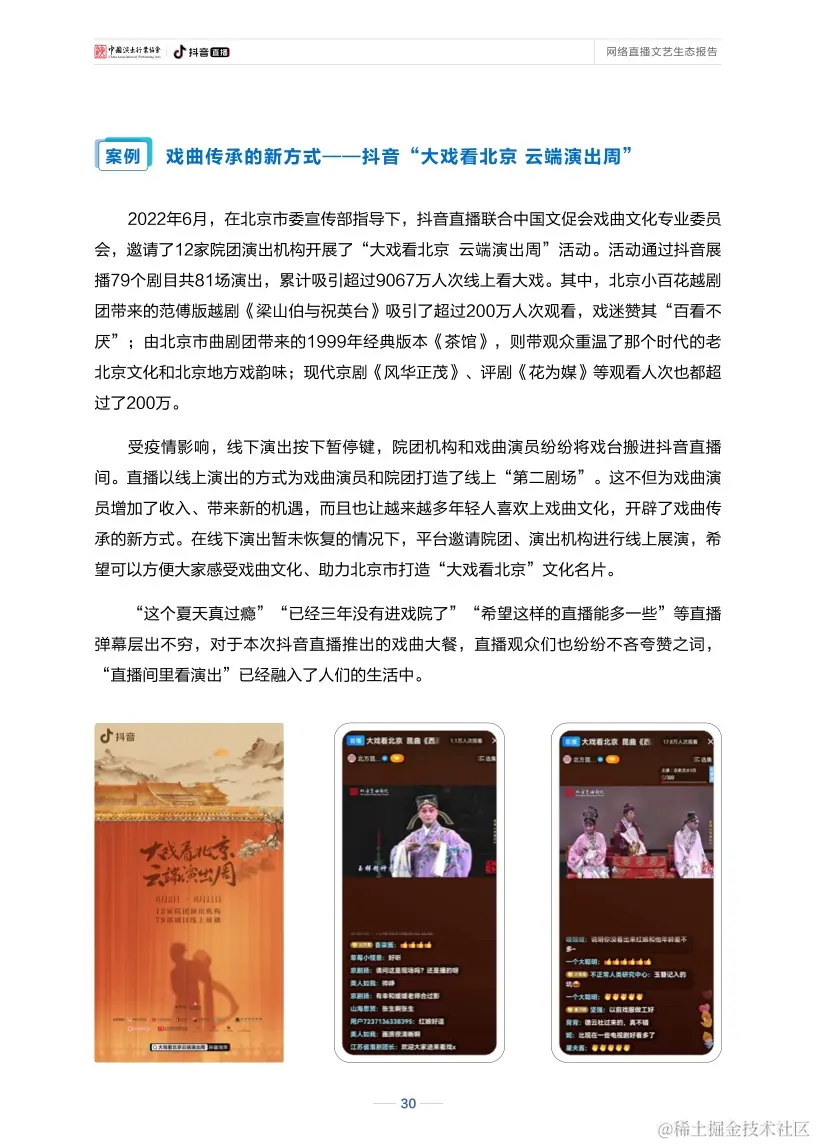 报告显示,新冠肺炎疫情发生以来,作为网络文艺新形态的直播已实现与戏剧、戏曲、话剧、歌剧等舞台艺术深度融合,产生了更加多维的文化影响。在直播间里听戏曲、看演出、赏才艺、学知识已成为新的文艺热潮。