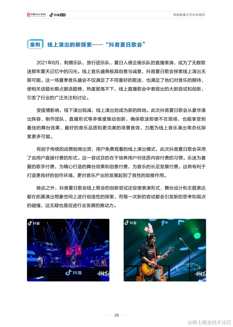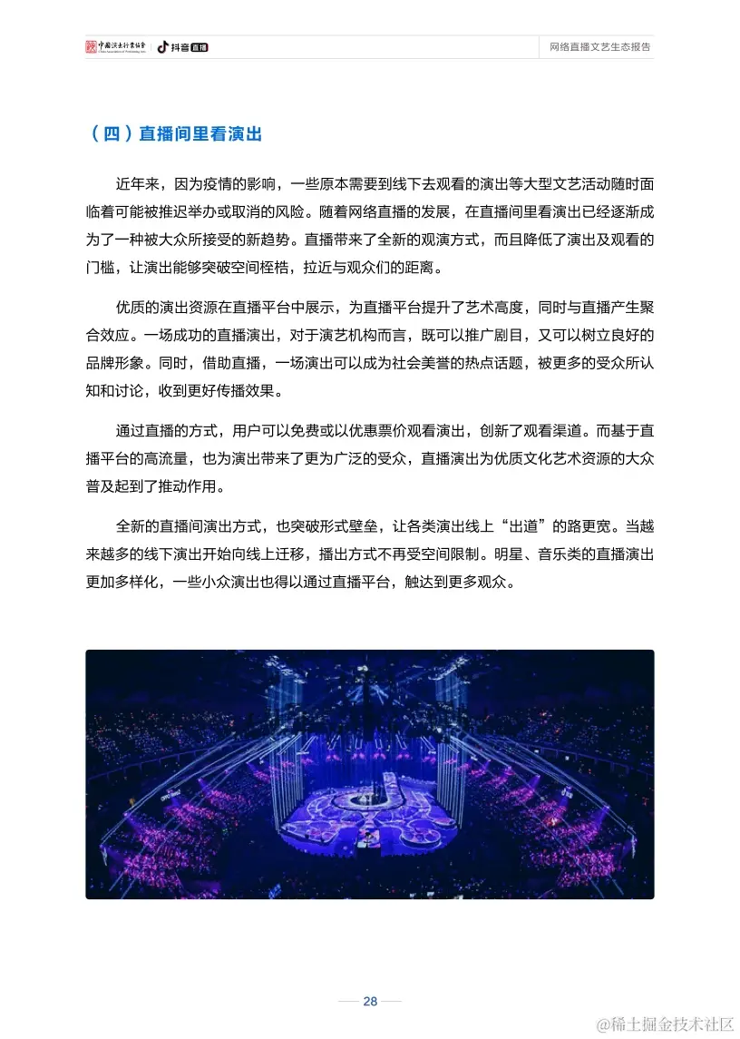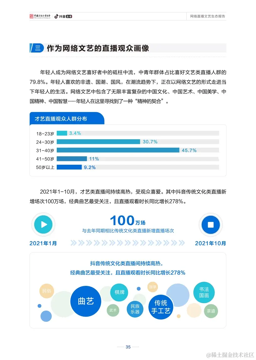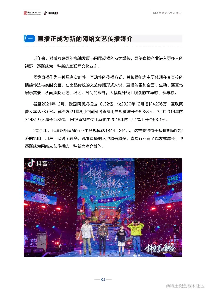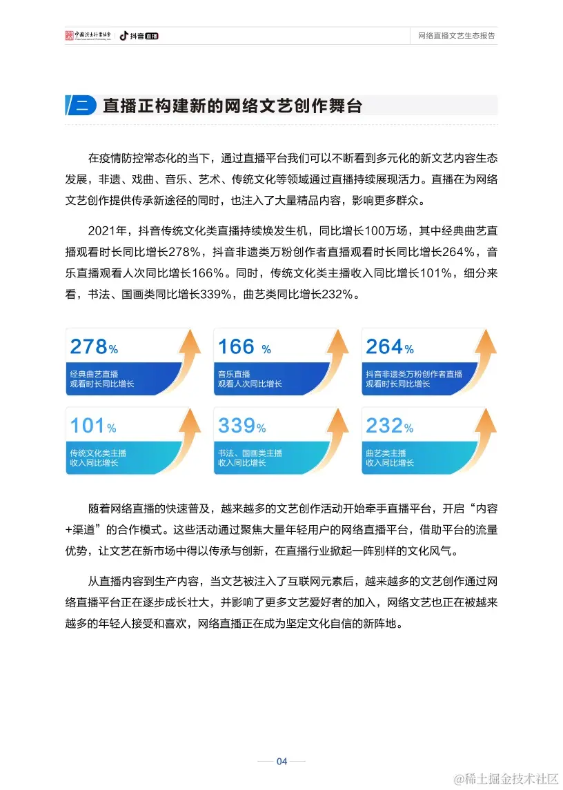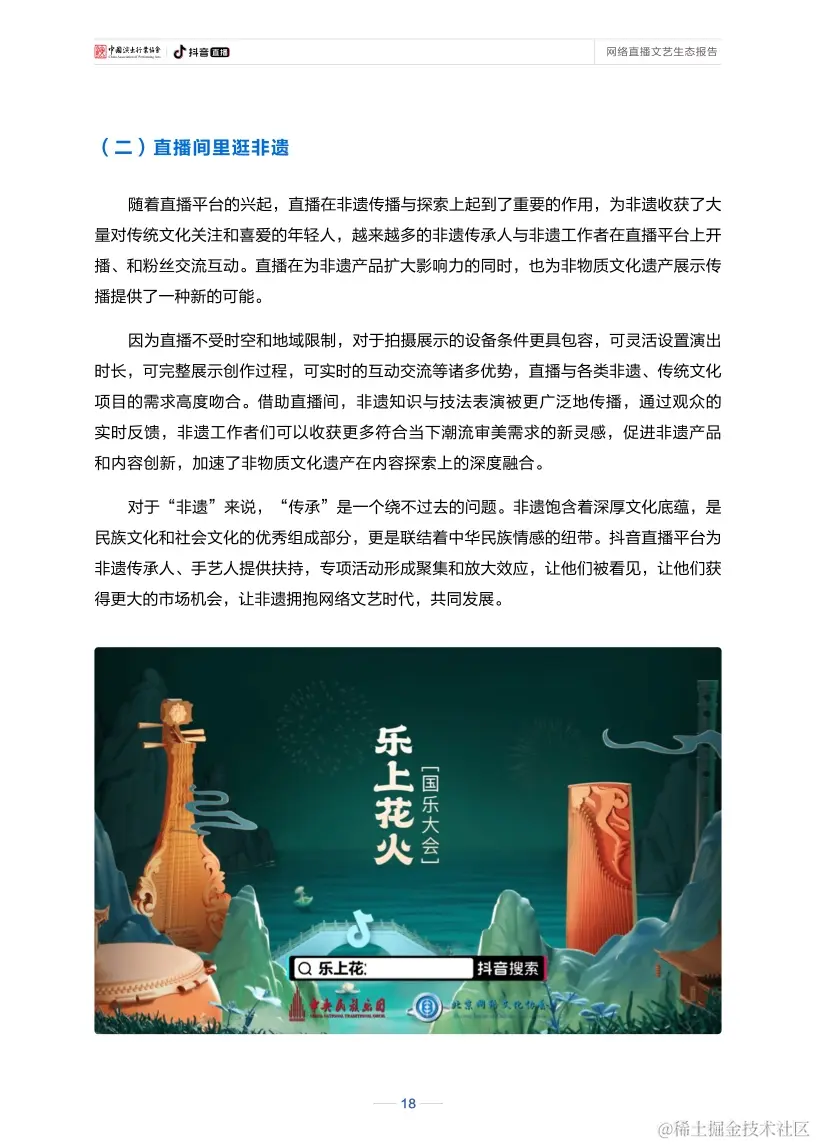 新冠肺炎疫情发生以来,直播为文艺作品提供了新的网络传播媒介,为文艺创作和表演提供了新的舞台,一直不断探索网络文艺发展的新路径。目前,与传统文化、文艺演出相关的直播场次和观看数量都明显增长,“云演出”“云音乐”“云戏曲”等各类直播内容创新层出不穷,“百戏争辉、声声不息”在线上得以实现。同时,直播也吸引了越来越多的年轻观众开始关注传统文化、欣赏舞台演出,网络直播成为了网络文艺领域中的一支新生先锋力量。
