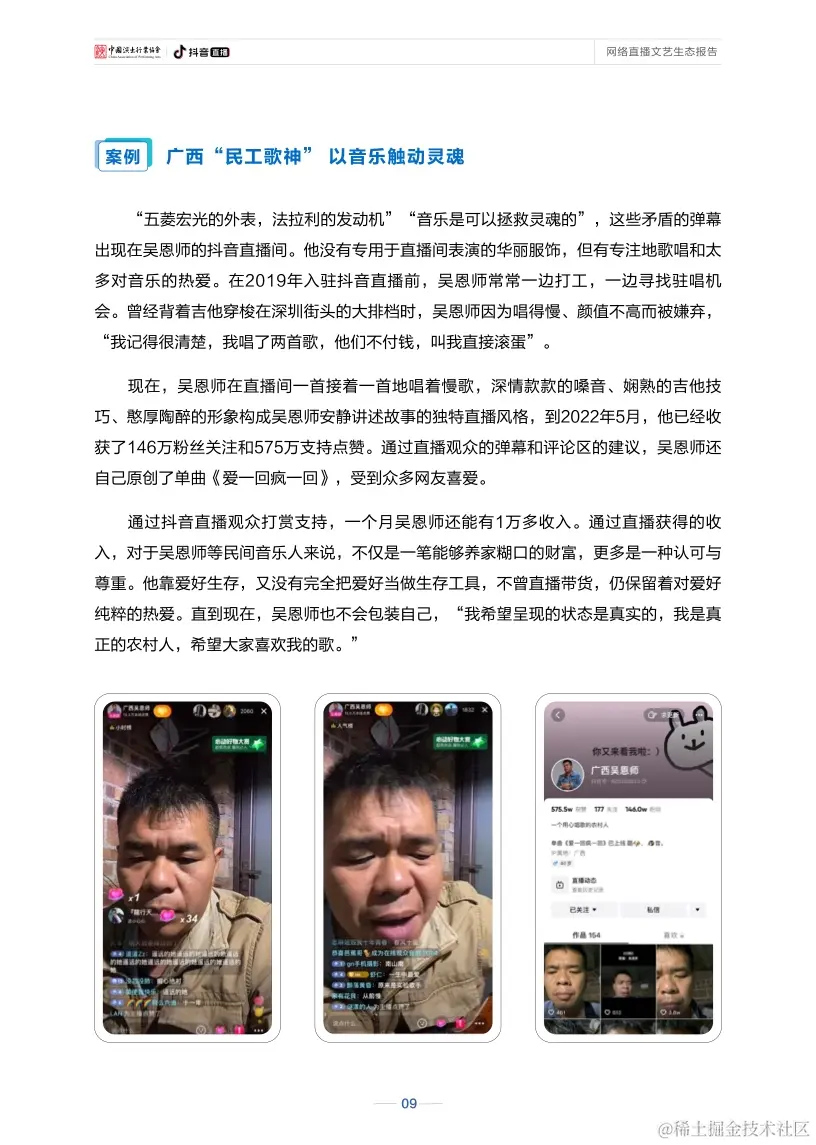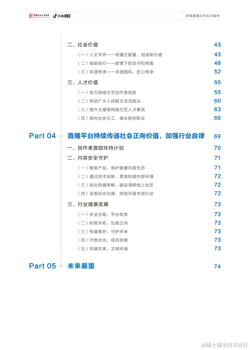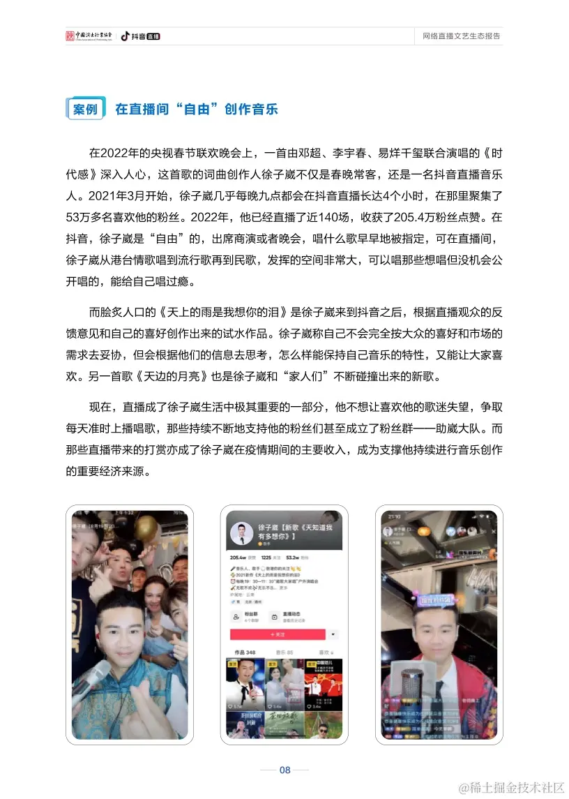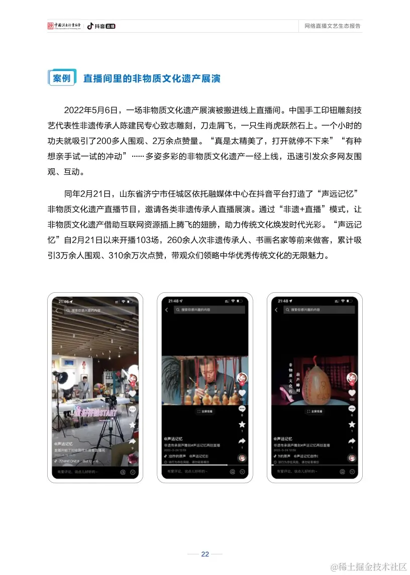 直播还不断驱动网络文艺打造新的产业价值、社会价值、人才价值。直播的自身特性,促使其可与其他产业相互借力、共同进步,也因其全面参与社会各领域的发展,在促进文化传播、引导精神文明建设、关怀大众感知等方面都展现出较高的社会价值。与此同时,直播也构建起了行业人才发展的良性生态和成长空间,从人才挖掘、培养到长期创收、共生,“全民直播”趋势日渐明显,直播已成为数字经济新业态,网络主播也逐渐成为持续向规范化专业化发展、具有稳定收入的新职业。