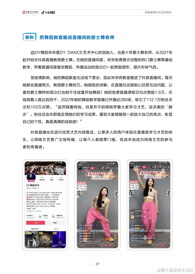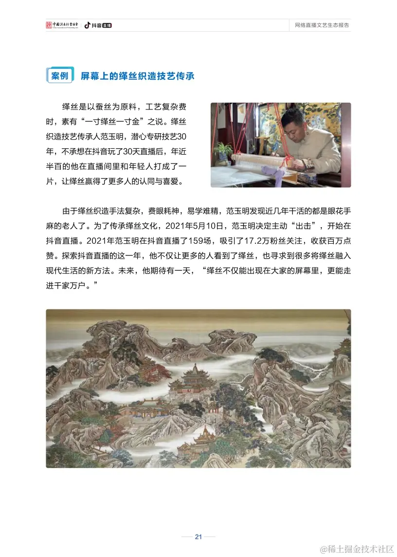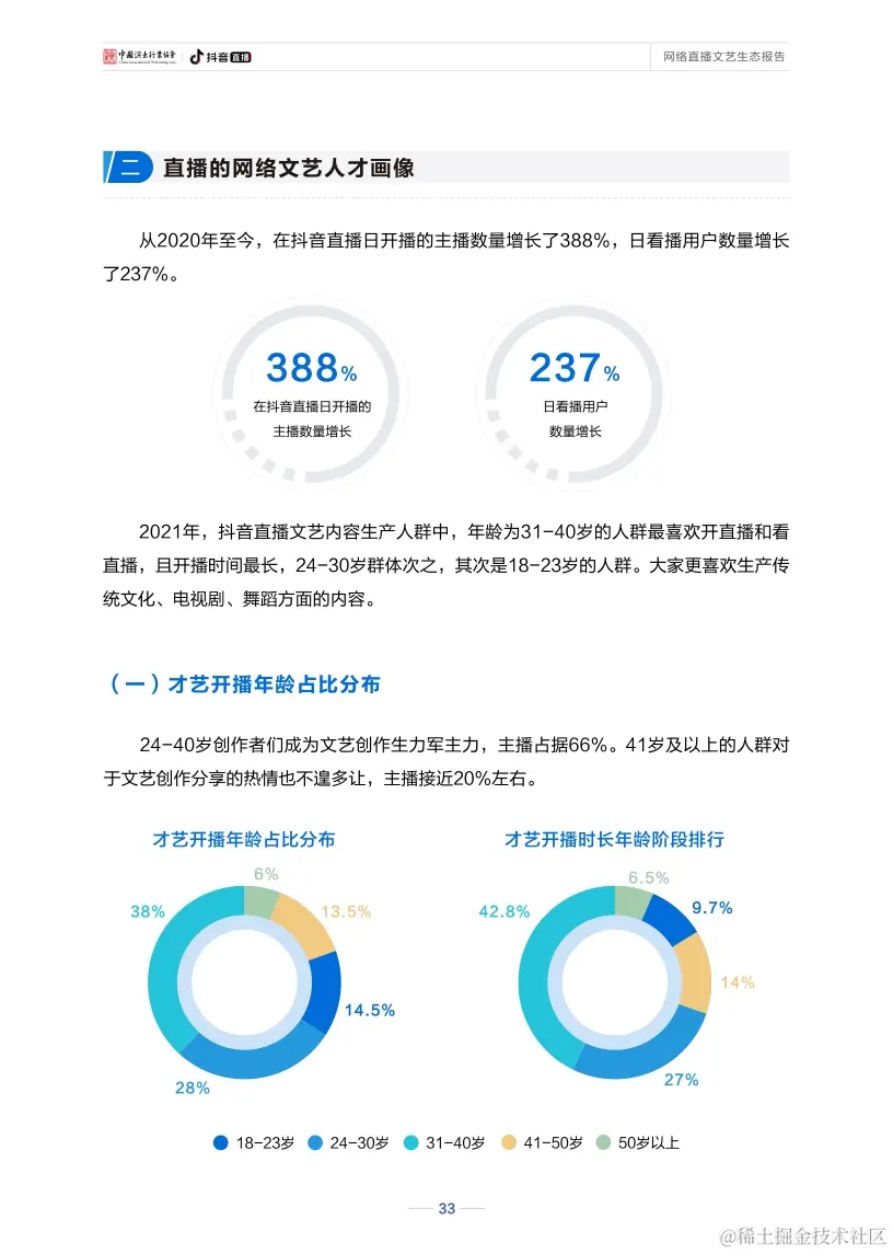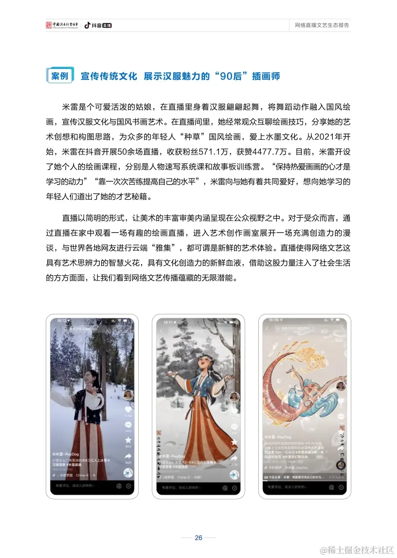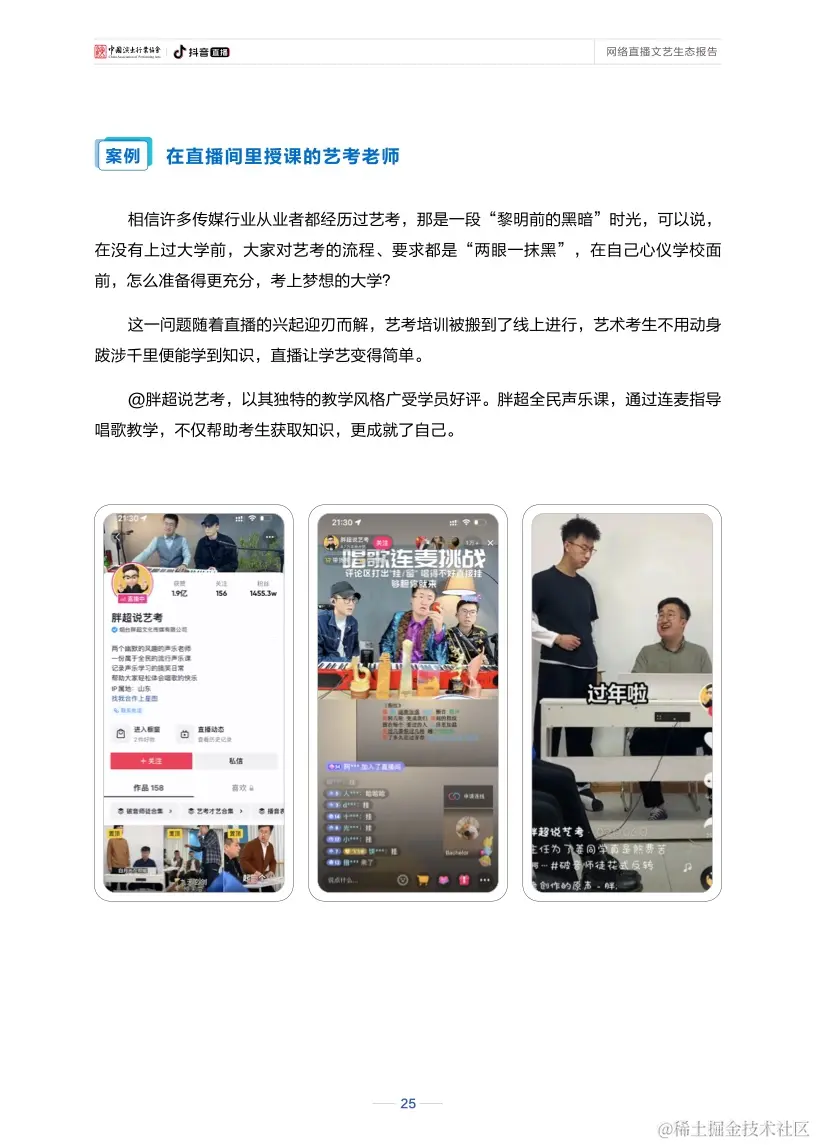 直播还不断驱动网络文艺打造新的产业价值、社会价值、人才价值。直播的自身特性,促使其可与其他产业相互借力、共同进步,也因其全面参与社会各领域的发展,在促进文化传播、引导精神文明建设、关怀大众感知等方面都展现出较高的社会价值。与此同时,直播也构建起了行业人才发展的良性生态和成长空间,从人才挖掘、培养到长期创收、共生,“全民直播”趋势日渐明显,直播已成为数字经济新业态,网络主播也逐渐成为持续向规范化专业化发展、具有稳定收入的新职业。