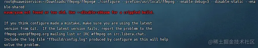 - 1./configure --prefix=/usr/local/ffmpeg --enable-debug=3 --disable-static --enable-shared --disable-x86asm