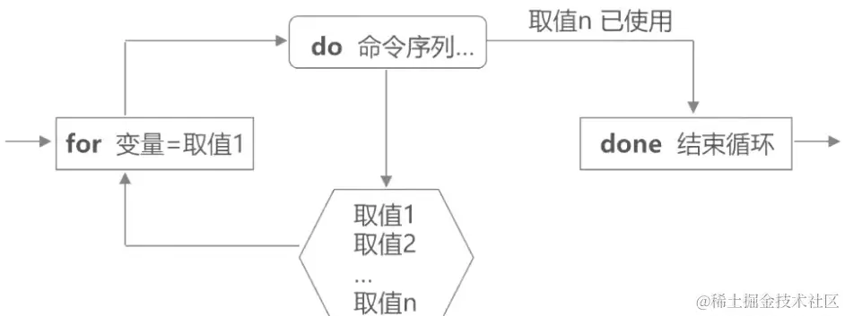 一种遍历的过程,读取不同的变量值,用来逐个执行统一组命令,一般用于循环次数事先已知的情况