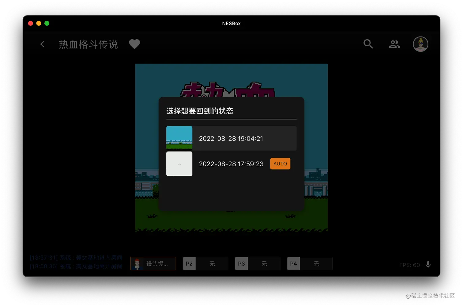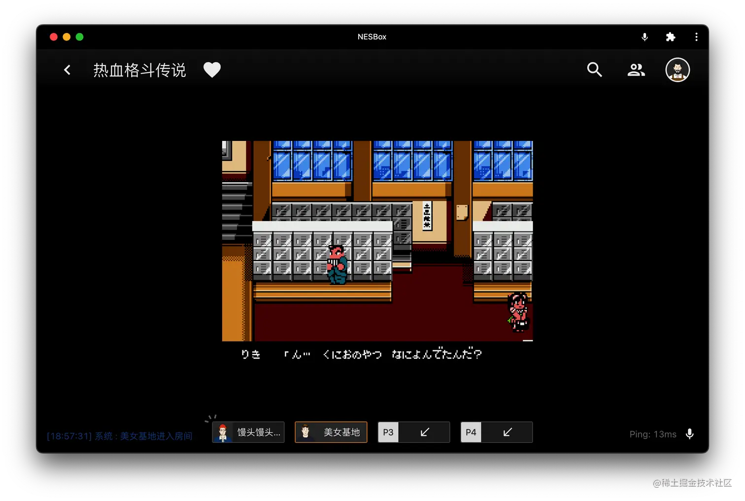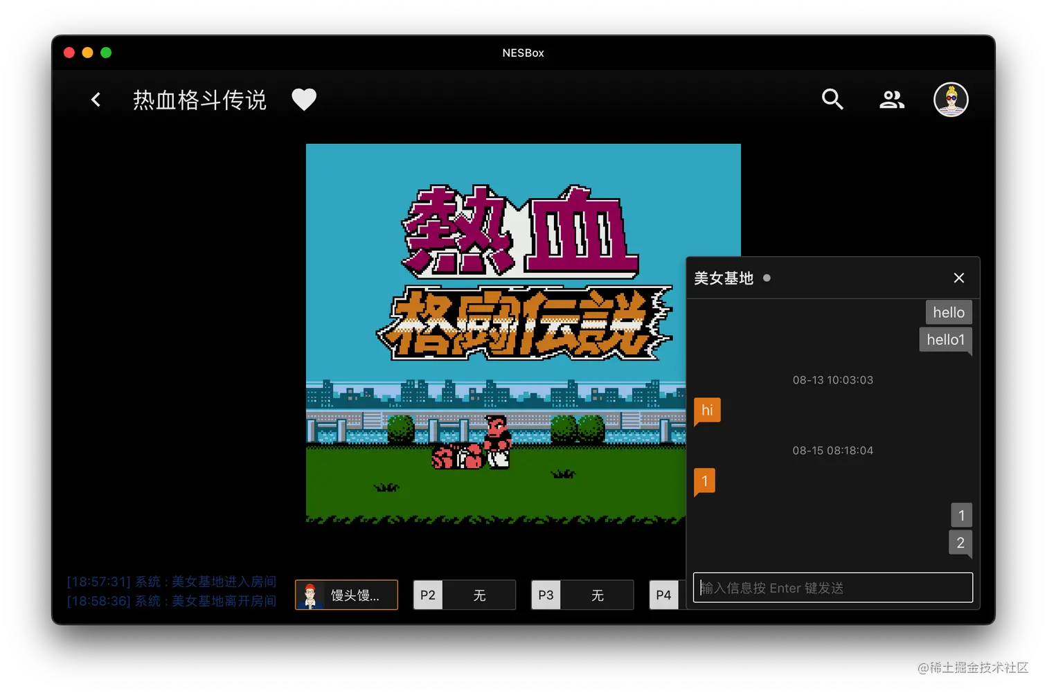 当其他用户进入房间后,该用户可以被自动安排到 P2 的位置,相当于拿到第二个游戏手柄,但他可以自由调整,主机也可以踢出他防止他占位置。此外,NESBox 支持房间内文字(左侧)、语音交流(右侧话筒加入语音)。