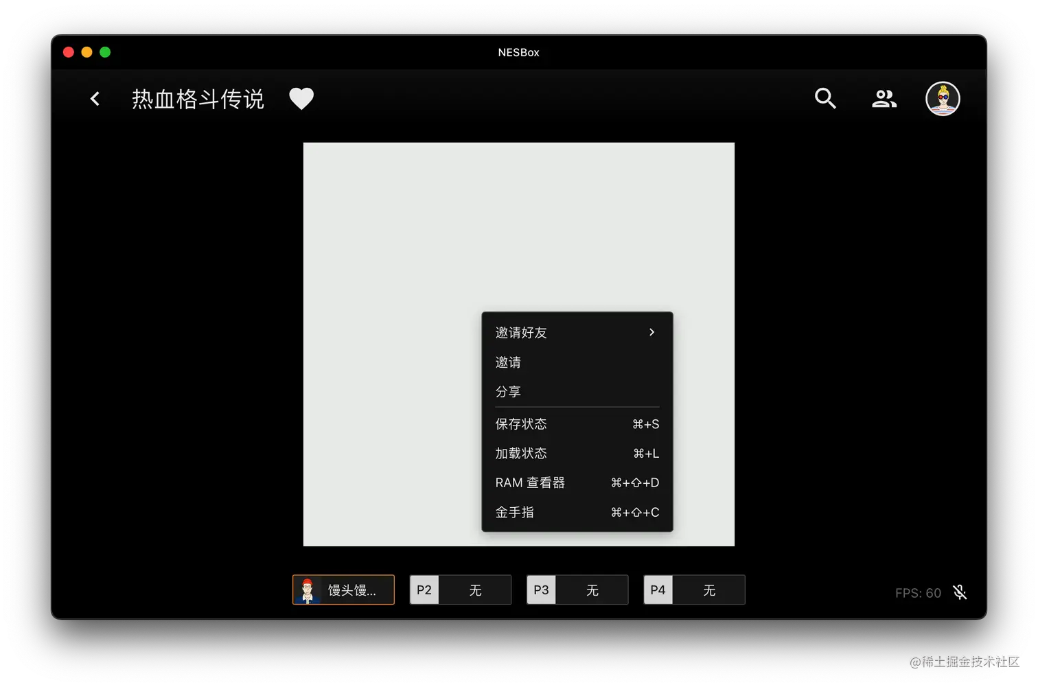 开启喜欢的游戏后,NESBox 会创建一个房间,其他用户可以在公开房间(以前默认是私有的,私有房间只有被邀请后才能进入,当前默认公开以加强用户之间的互动性)页面找到并加入。