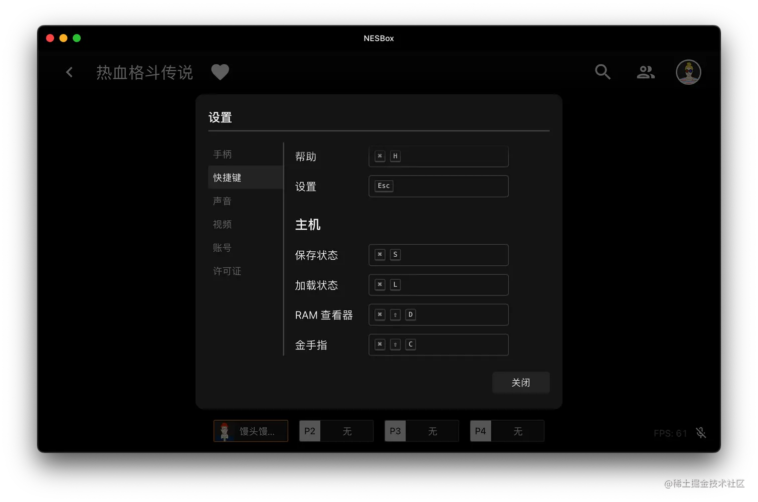 可以看到,NESBox 还支持保存游戏状态供下次载入继续游戏,也支持内存检查和金手指编辑,这些功能都有对应的快捷键,点击右上角的头像可以打开设置窗口进行设置。游戏按钮也可以在该窗口的“手柄”选项卡下配置。