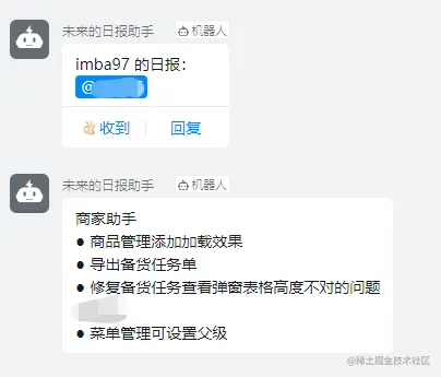 也就是说我只要上班,电脑开着,它到时间就会自动收集今天 git 提交中带有前缀的内容,整理好并发到一个钉钉群里